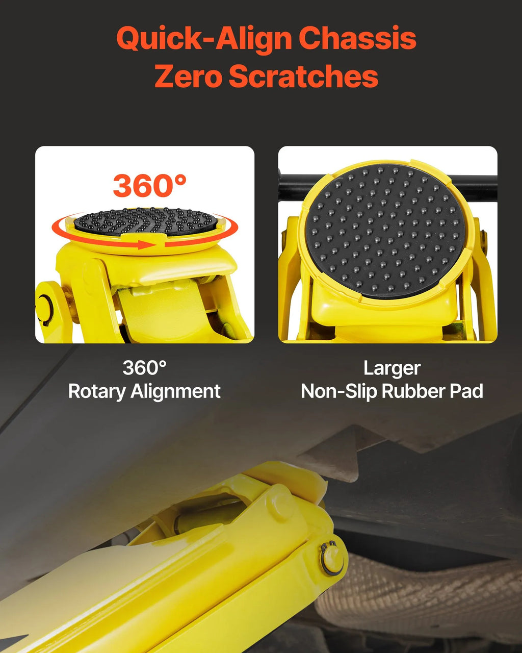 Drošs atbalsts: Izgatavots no smagās tērauda konstrukcijas, šis domkrats minimizē šūpošanos vai kritienu pacelšanas laikā. Rotējošā sēdekļa virsma ar neslīdošu gumijas spilventiņu aizsargā transportlīdzekļa apakšdaļu un ātri saskaņo domkratu ar pacelšanas punktiem.