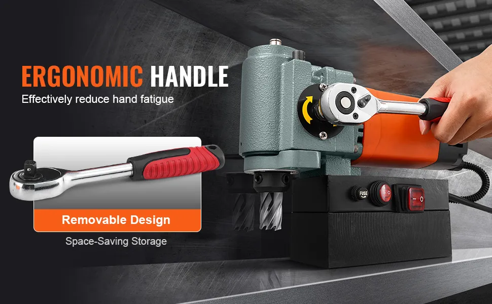 Rokturis ir viegli noņemams, ļaujot ērti pārvietot urbjmašīnu starp dažādām darba vietām vai uzglabāt to ierobežotās telpās. Pateicoties sviras principa konstrukcijai, magnētiskā urbjmašīna nodrošina ērtāku un mazāk nogurdinošu darbību, samazinot slodzi lietošanas laikā.