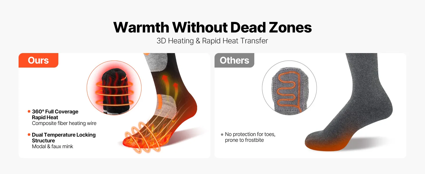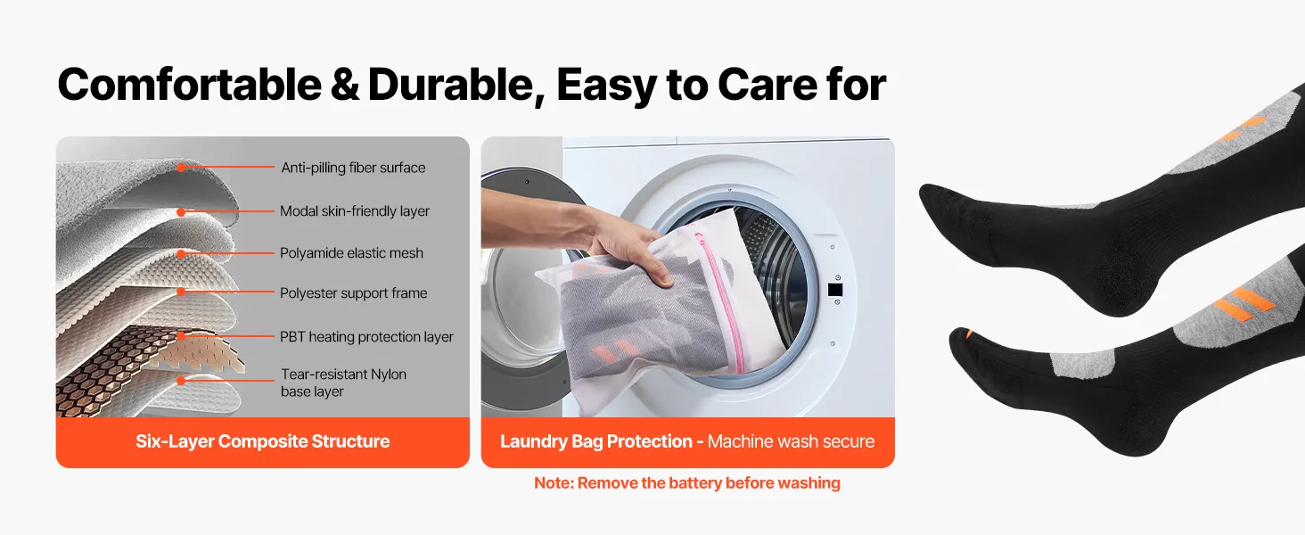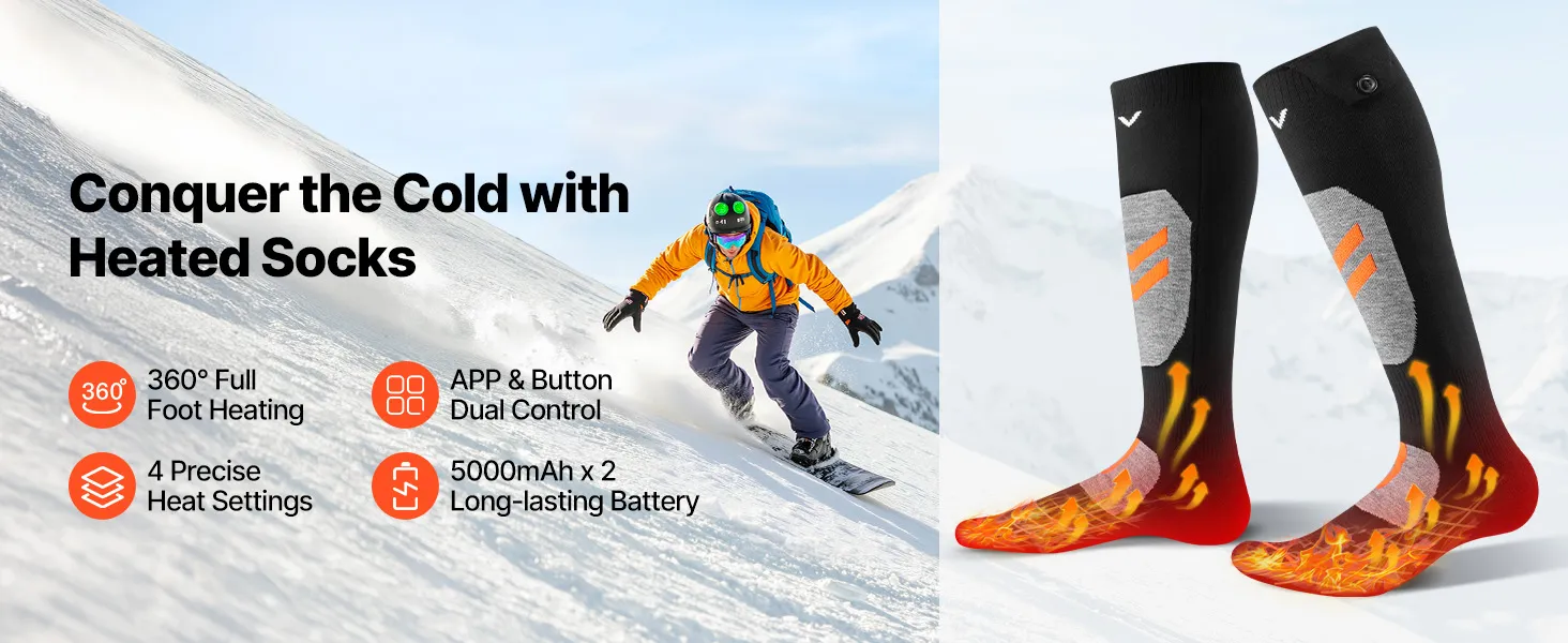S_VEVOR apsildāmās zeķes ar 5000 mAh akumulatoru, uzlādējamas, ar 4 apsildes līmeņiem un lietotnes vadību; piemērotas sievietēm un vīriešiem medībām, izjādēm, kempingam un pārgājieniem