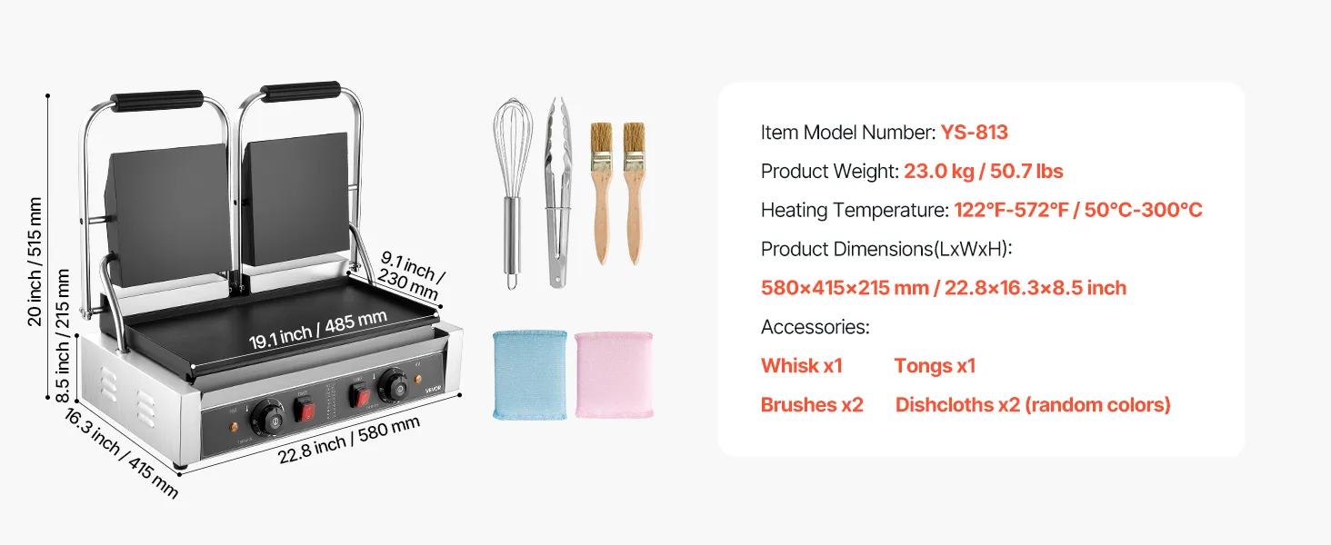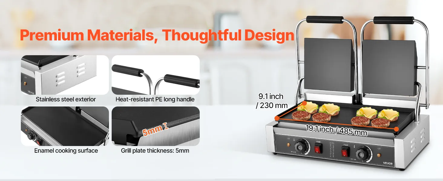 Vienmērīga un ātra uzsildīšana: aprīkots ar biezinātām sildcaurulēm, elektriskais sviestmaižu panini grils vienmērīgi un efektīvi uzsilda 485 × 230 mm gatavošanas virsmu. Augšējās un apakšējās restes uzkarst vienlaikus, nodrošinot efektīvu gatavošanu.