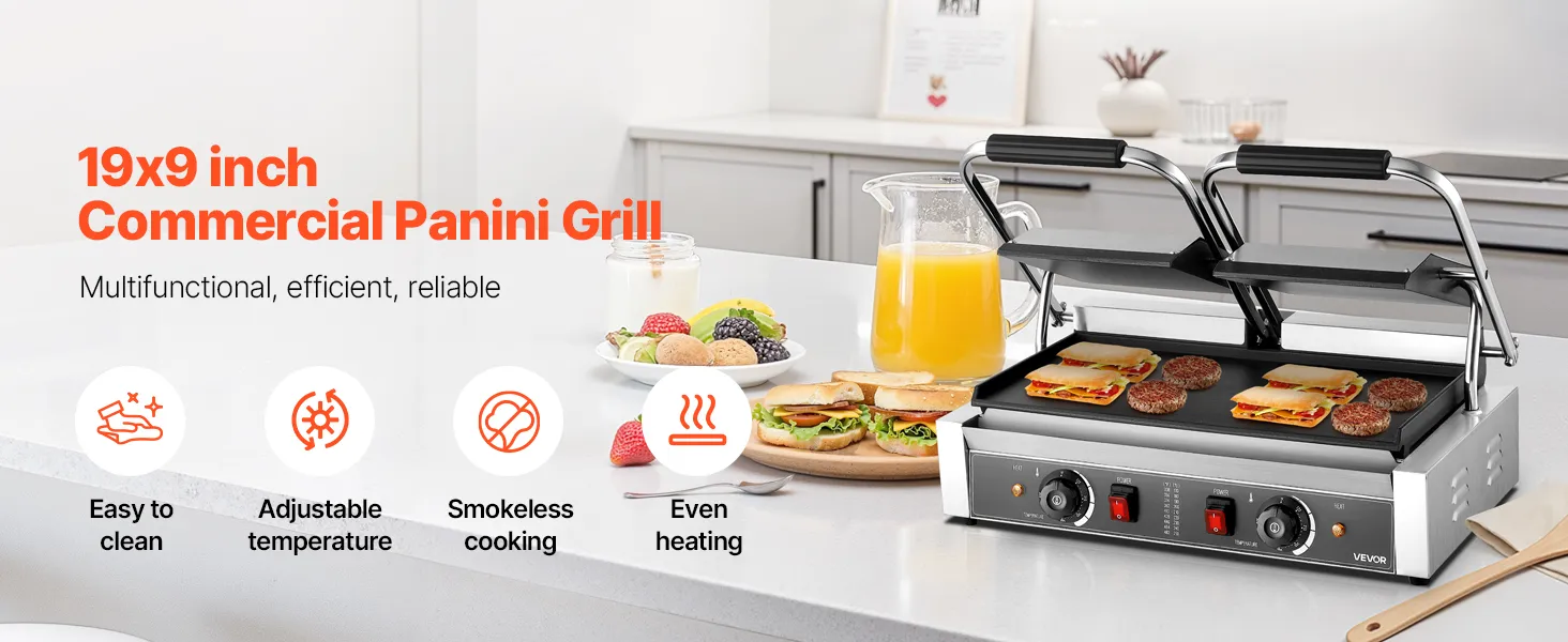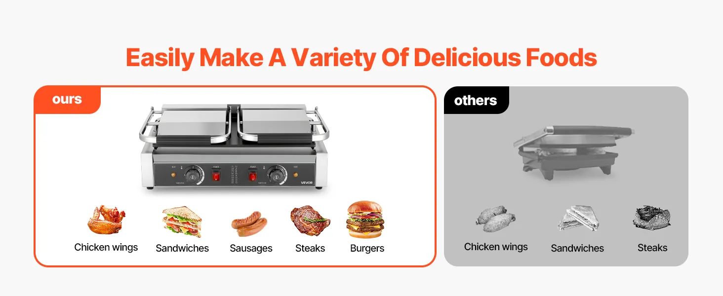 Daudzfunkcionāls grils: šī panini grilēšanas iekārta ļauj vienlaikus gatavot dažādus ēdienus, padarot to ideāli piemērotu dārzeņu, gaļas, siera, olu kultenes, panini sviestmaižu, burgeru, vistas, brokastu ēdienu, steiku un citu produktu pagatavošanai.