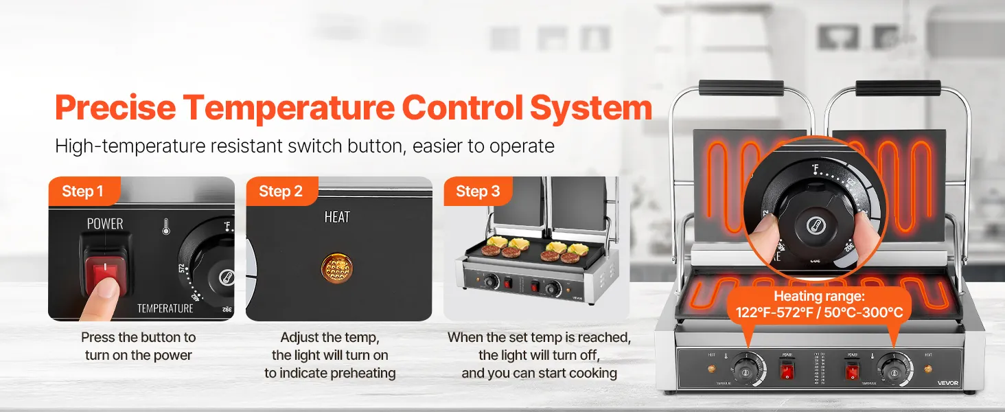 Precīza temperatūras kontrole: sviestmaižu prese ir aprīkota ar temperatūras regulēšanas pogām diapazonā no 50 °C līdz 300 °C. Šis risinājums atbilst dažādu ēdienu gatavošanas prasībām. LED indikators parāda uzsildes statusu.