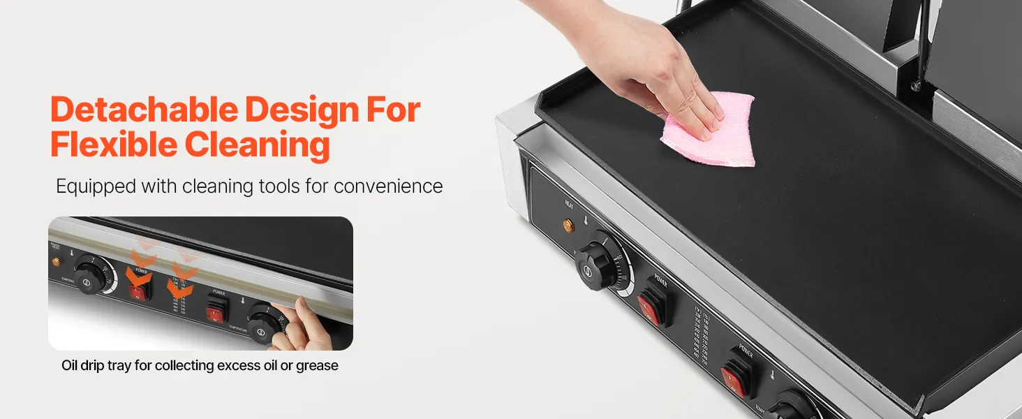 Viegla tīrīšana: panini grils ir aprīkots ar noņemamu eļļas trauku, kas vienkāršo tauku un atkritumu savākšanu. Kopšanu atvieglo skrāpis un sausa drāna. Abās pusēs izvietotās ventilācijas atveres efektīvi izkliedē siltumu.