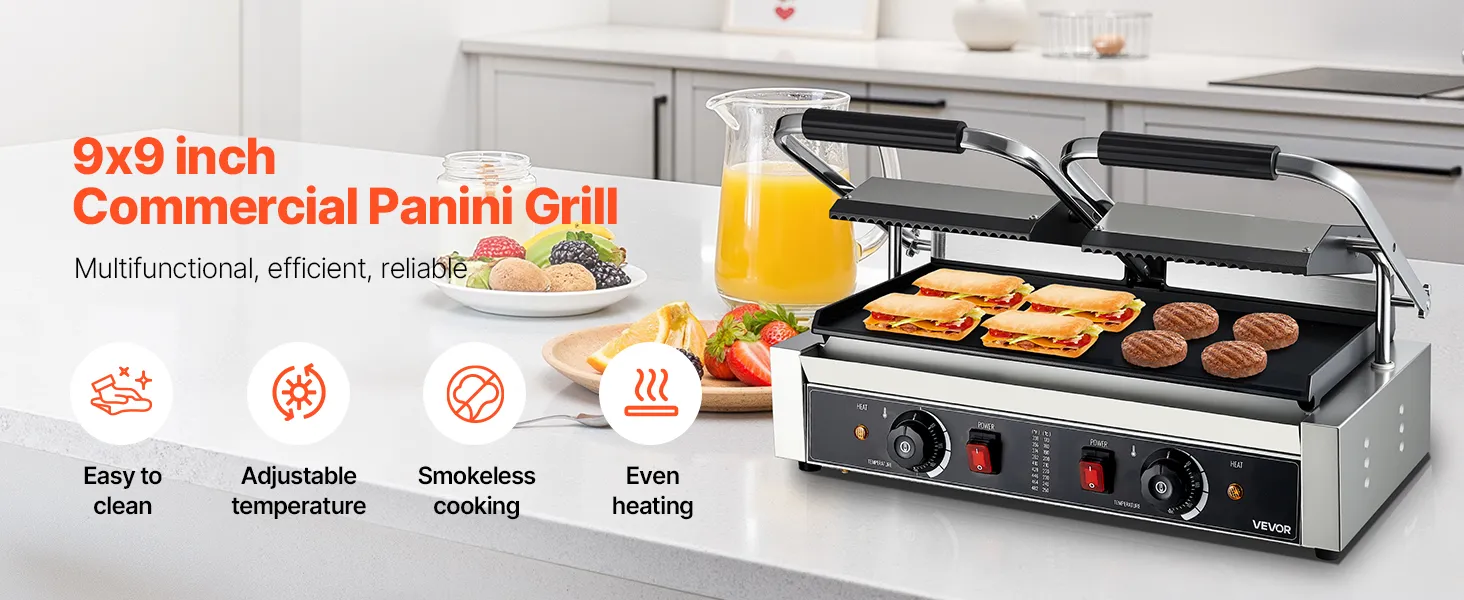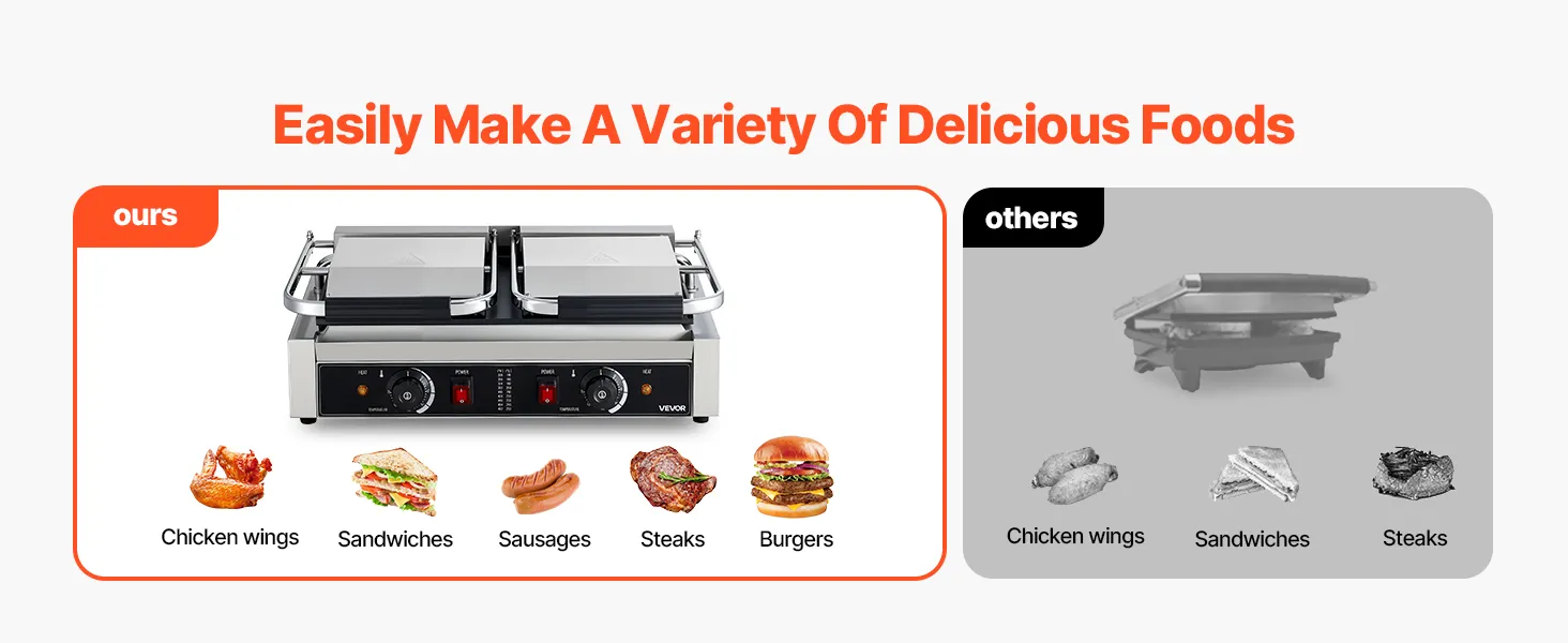 Mūsu komerciālais panini grils spēj gatavot dažādus ēdienus, padarot to par daudzfunkcionālu risinājumu ģimenes pasākumiem, ielu tirdzniecībai, restorāniem un citām vajadzībām.