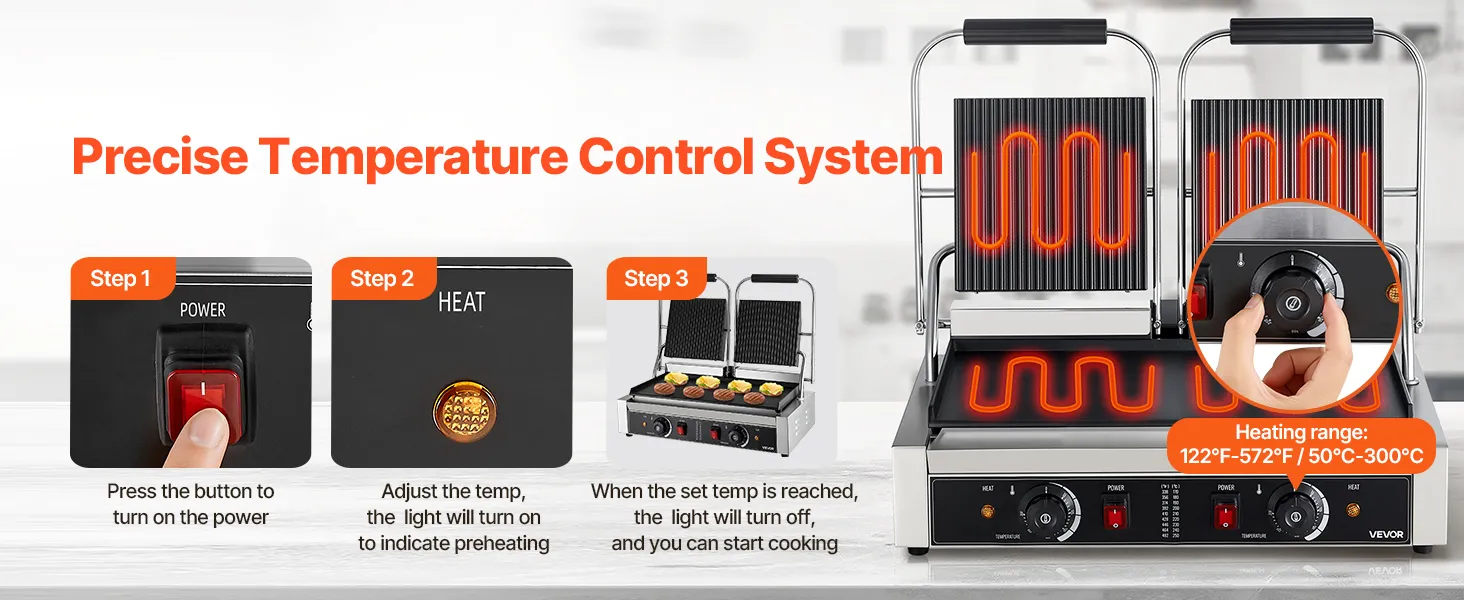 Elektriskais panini sviestmaižu gatavotājs ir aprīkots ar precīzu temperatūras kontroles sistēmu ar regulēšanas diapazonu no 50 °C līdz 300 °C.