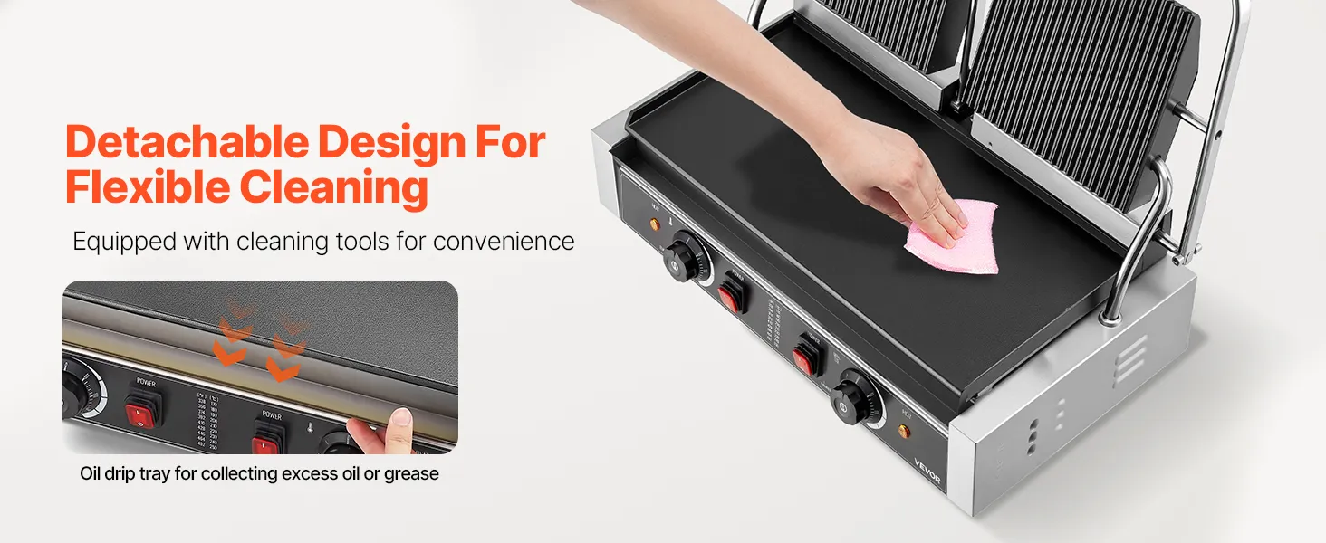 Elektriskais nerūsējošā tērauda sviestmaižu gatavotājs ir aprīkots ar izņemamu paplāti, kas savāc taukus, eļļu un atlikumus no gatavošanas virsmas, padarot tīrīšanu vienkāršu un ērtu.