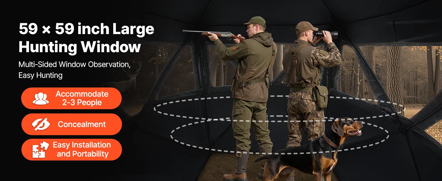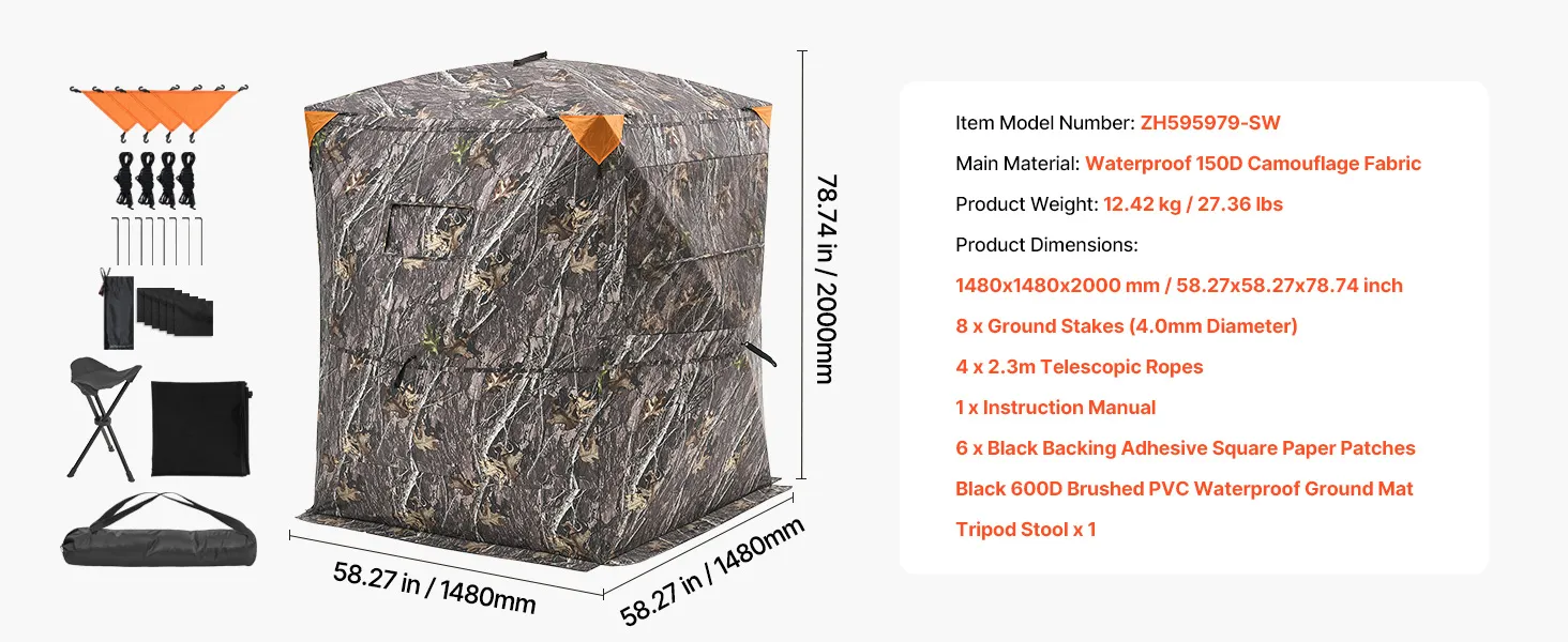 Izmēri: 1500 × 1500 × 2000 mm. Lielais interjers ļauj ērti izvietoties 2–3 cilvēkiem. Slēpnis aprīkots ar noņemamu dimanta raksta brīdinājuma audumu, kas palielina redzamību un drošību. Komplektā ietilpst krēsls, kas nodrošina papildu komfortu ilgstošu medību laikā.
