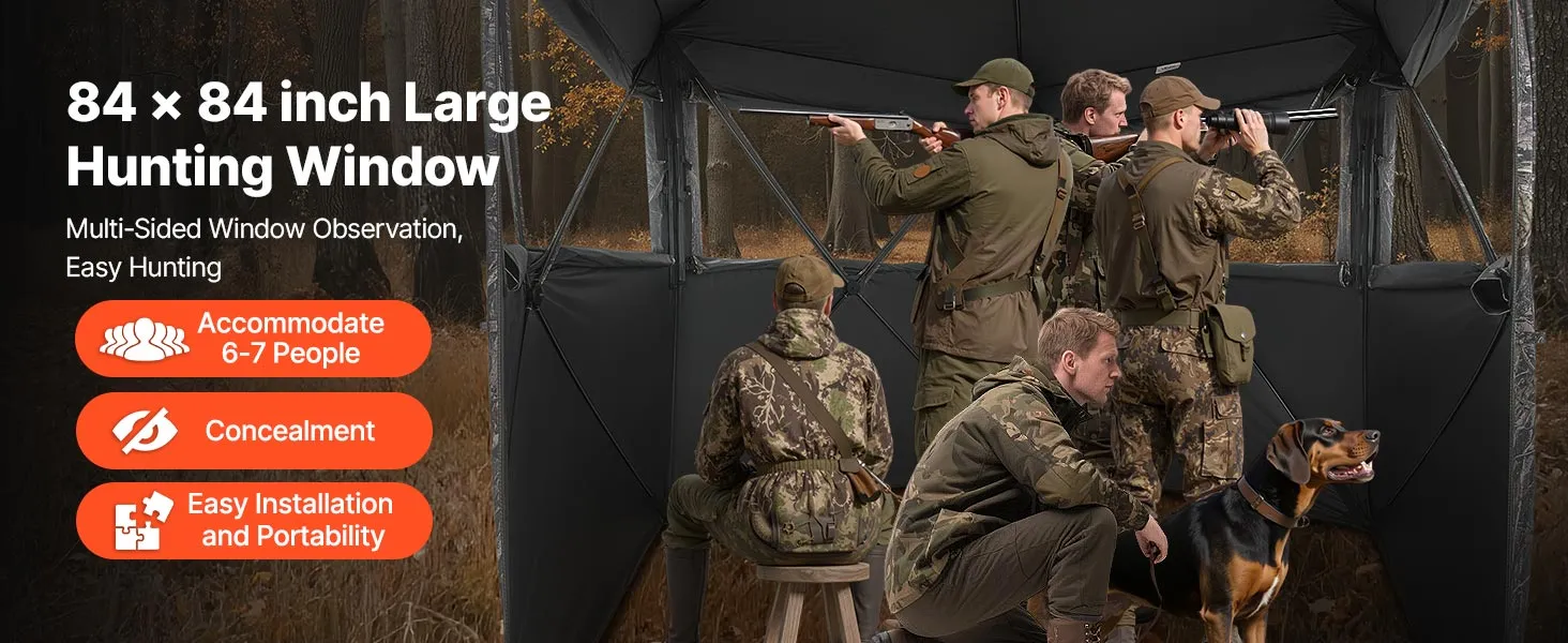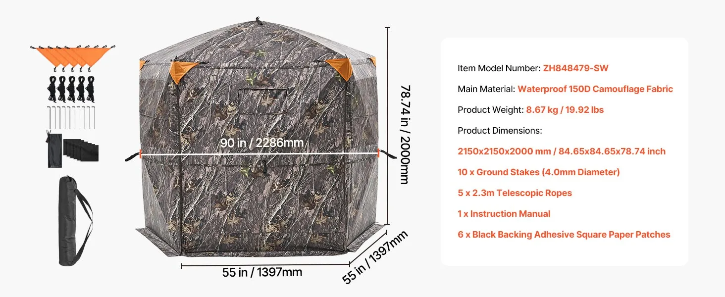 Izmēri: 2130 × 2130 × 2000 mm. Lielais interjers ļauj ērti izvietoties 6–7 cilvēkiem. Slēpnis aprīkots ar dimanta raksta brīdinājuma audumu, kas ir noņemams, lai palielinātu redzamību un novērstu nejaušus savainojumus.