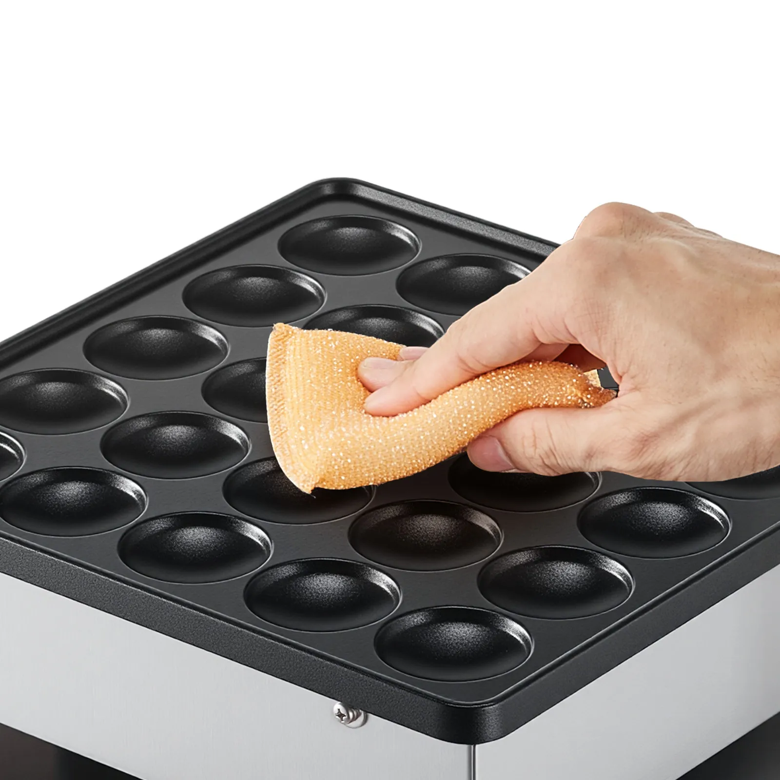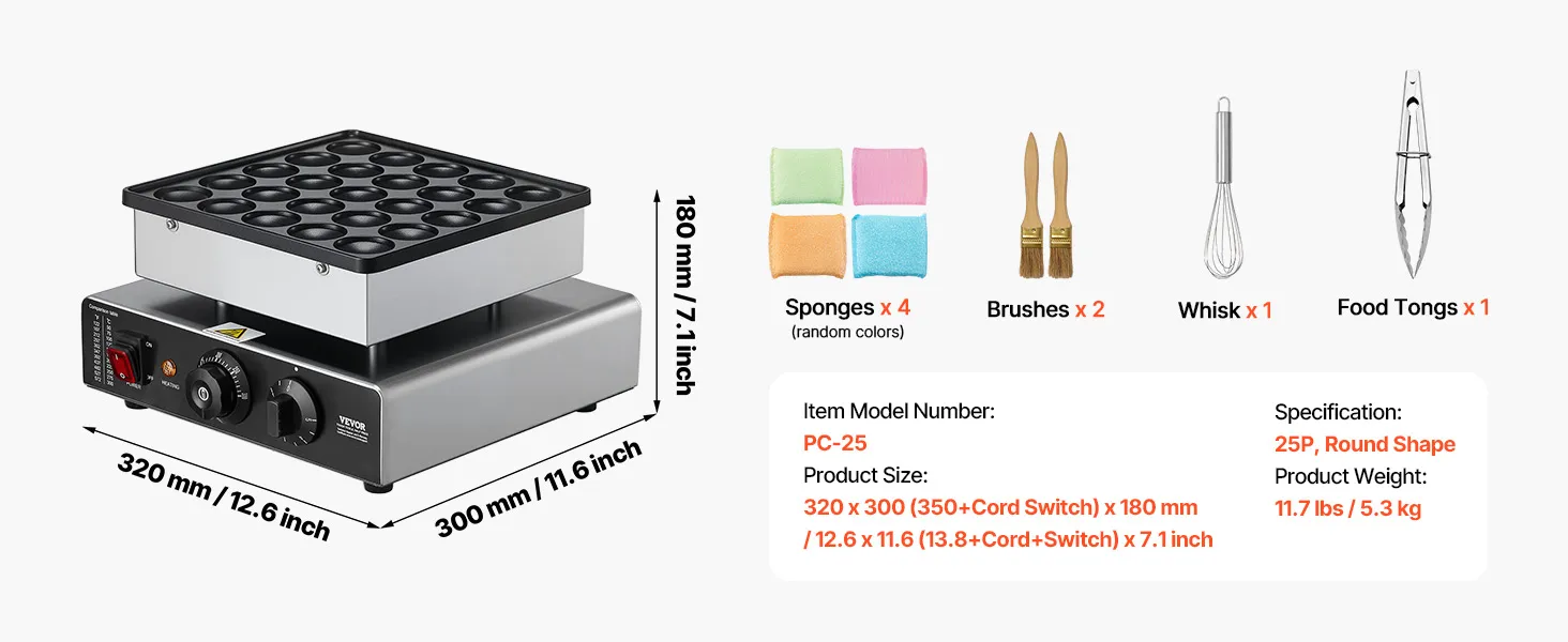 Komerciālas kvalitātes materiāli: elektriskā poffertjes grila korpuss izgatavots no augstas kvalitātes 0,8 mm nerūsējošā tērauda, kas nepakļaujas rūsai. Četras gumijas kājiņas apakšā nodrošina stabilitāti lietošanas laikā. Komplektā ietilpst arī piederumi: 2 birstes, 4 sūkļi (dažādās krāsās), 1 knaibles un 1 putojamais, kas palīdz cepšanā.