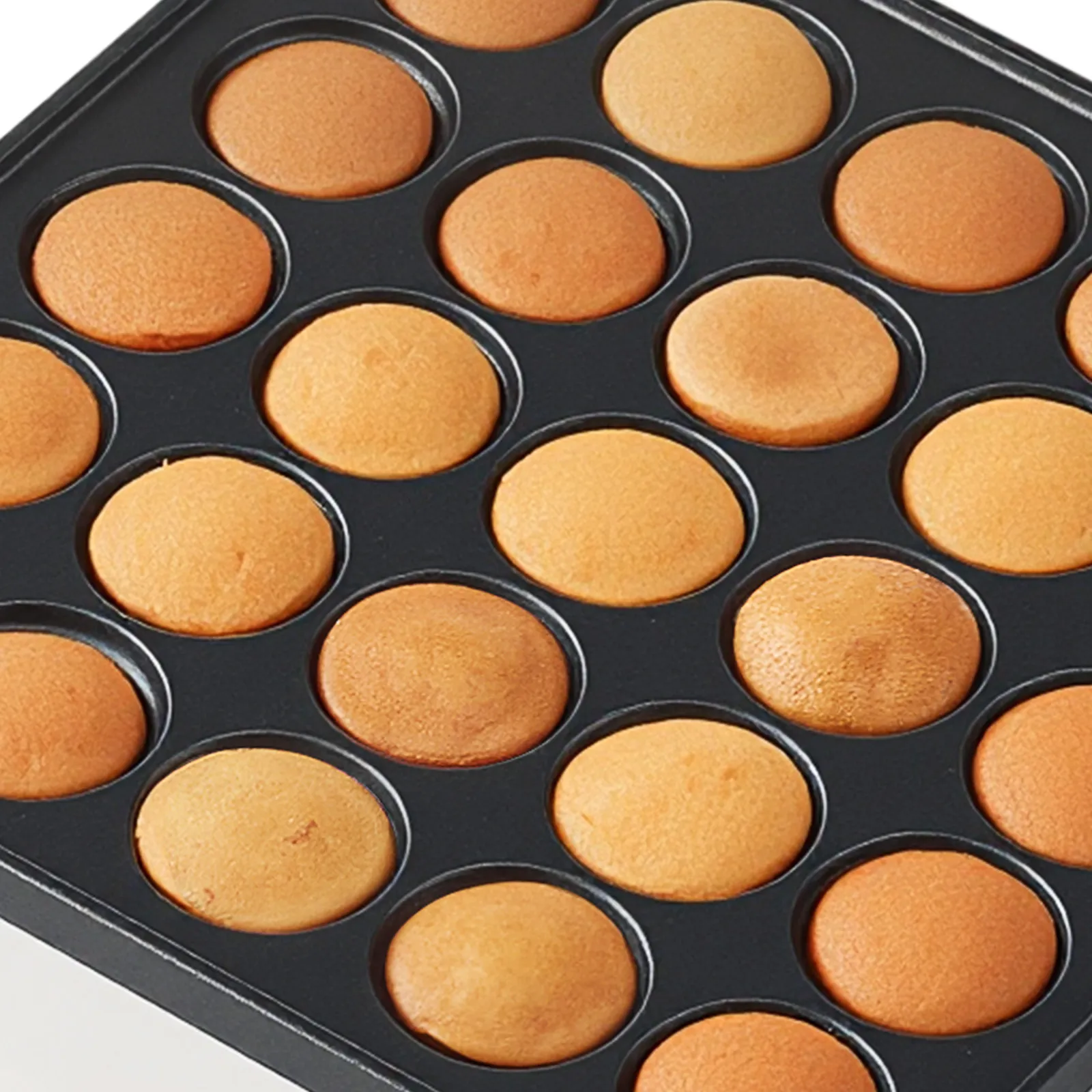 Ātra pagatavošana: augstas jaudas mini pankūku aparāts ar cepšanas virsmu 262 x 262 mm vienlaicīgi pagatavo 25 mini pankūkas (apmēram Ø43 mm). Tās kļūst kraukšķīgas no ārpuses un mīkstas no iekšpuses tikai 3–5 minūtēs, ievērojami ietaupot laiku un padarot brokastu gatavošanu ērtu. Vienmērīgi izvietotie sildītāji nodrošina vienmērīgu cepšanu.