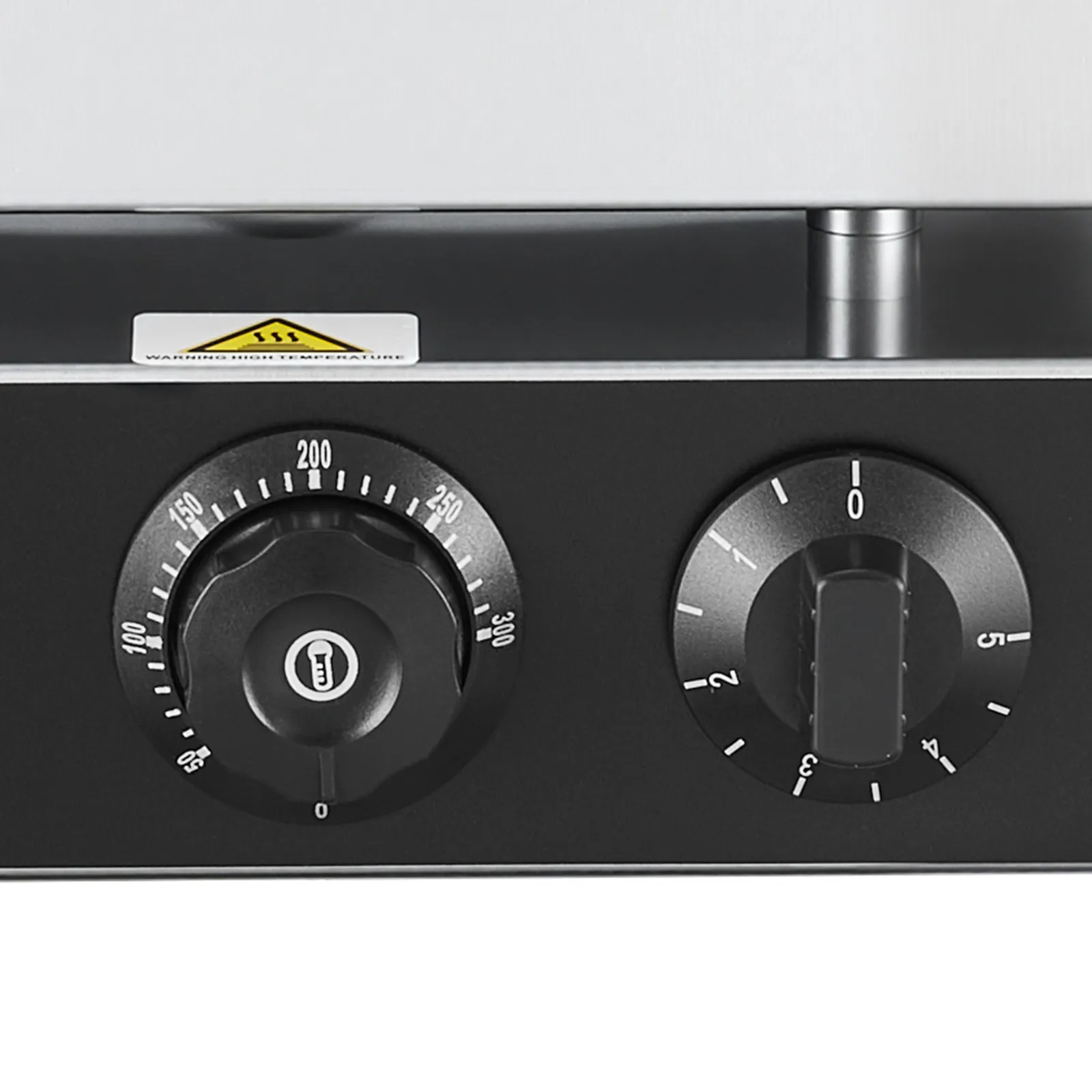 Precīza temperatūras un laika kontrole: aprīkots ar regulēšanas pogu (50 °C–300 °C), kas ļauj iestatīt temperatūru pēc vajadzības. Iespējams pagatavot gan kraukšķīgas, gan gaisīgas pankūkas. Atgādinājuma funkcija paziņo, kad pievienot mīklu un kad pankūkas ir gatavas, tādēļ nav nepieciešama nepārtraukta uzraudzība.