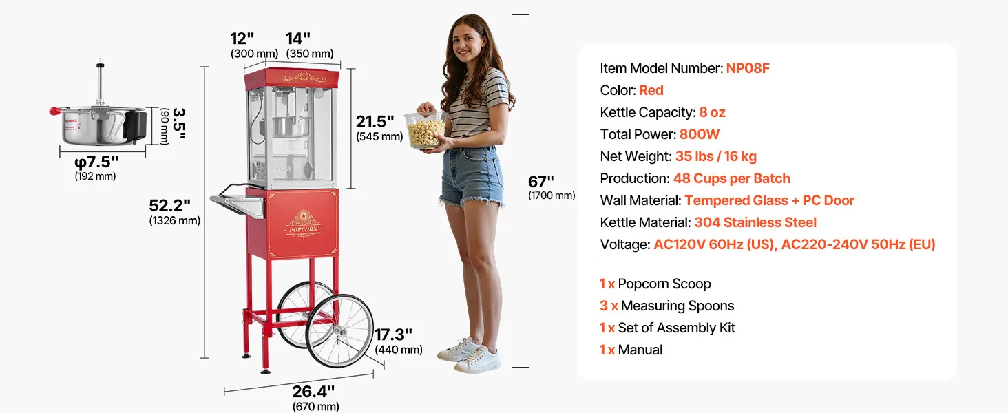 Retro 8 oz popkorna mašīna: šai popkorna mašīnai ar ratiņiem ir 0,2 kg katls, kas vienā reizē var pagatavot līdz 48 porcijām popkorna, pietiekami 6–8 cilvēkiem. Lieliski piemērota sporta faniem un ballīšu viesiem.