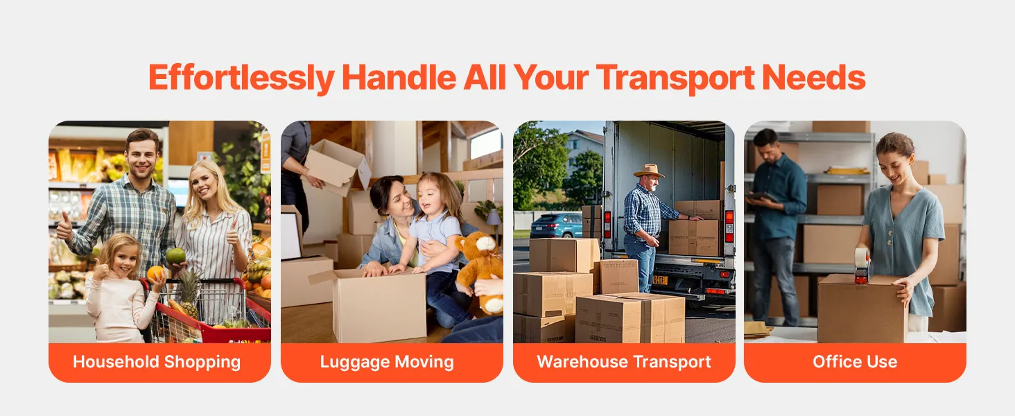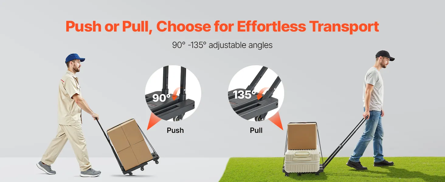 Ar regulējamiem 90° un 135° leņķiem šie saliekamie ratiņi nodrošina pielāgojamību dažādiem uzdevumiem, atvieglojot smagu priekšmetu pārvietošanu ar mazāku piepūli.