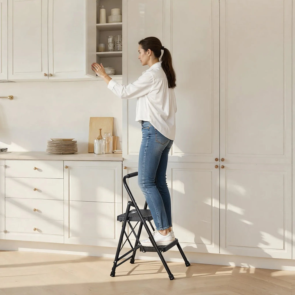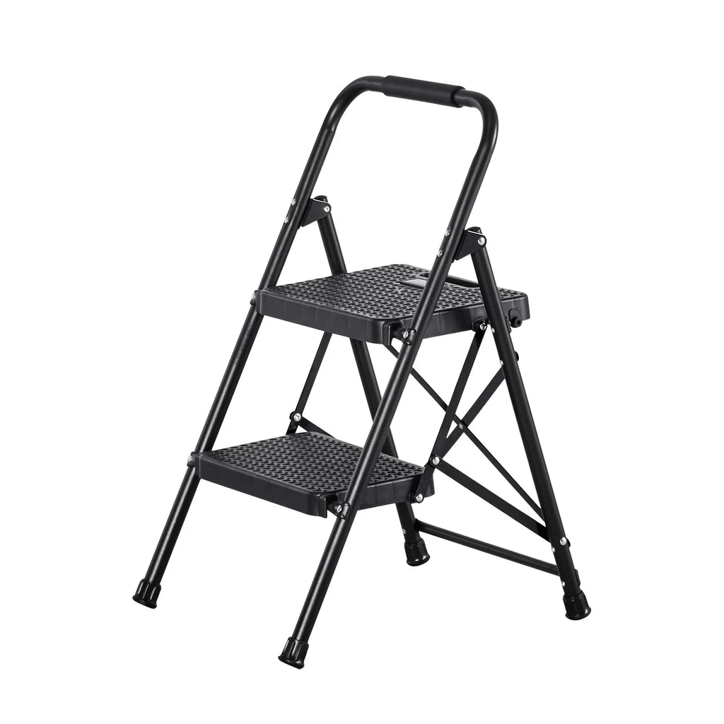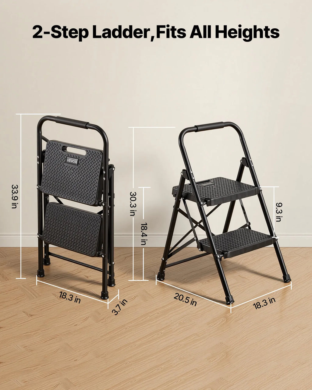 VEVOR 2 pakāpju saliekamās kāpnes ar platu pretslīdes pakāpienu un ērtu rokturi, pārnēsājamas tērauda kāpnes ar 272 kg nestspēju, lietošanai virtuvē, mājās un birojā, melnas