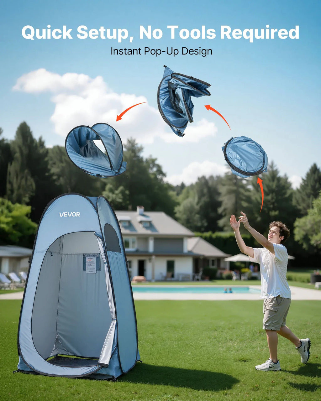 Automātiskās atvēršanās dizains: Izņemot no somas, privātuma telts atveras manuāli vai automātiski izplešas formā. Uzstādīšana aizņem mazāk nekā 1 minūti. Nav nepieciešamas īpašas iemaņas, tāpēc tā ir piemērota arī iesācējiem.