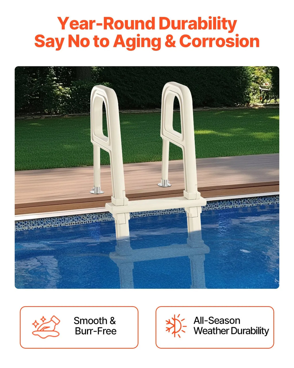 VEVOR baseina kāpnes ar 75° slīpumu, 5 pakāpieni un dubultas margas, pastiprināti neslīdoši pakāpieni, maksimālā slodze 136 kg, piemērotas 122–137 cm dziļiem iebūvētiem un virszemes baseiniem ar jebkura veida klāja segumu lietošanai iekštelpās un ārā
