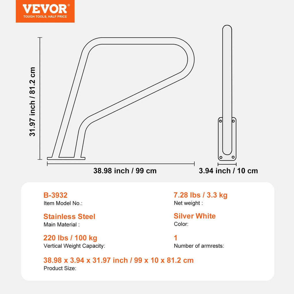 VEVOR baseina margas 99 × 81 cm, nerūsējošā tērauda drošības margas ar pamatplāksni iekštelpu un āra baseiniem, pretslīdes satvēriena stienis ar pārklājumu un piederumiem spa zonām