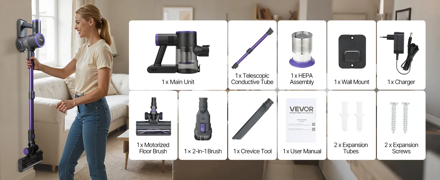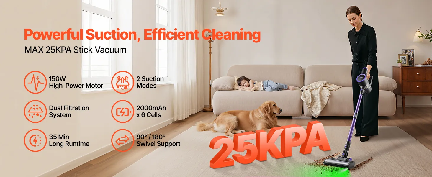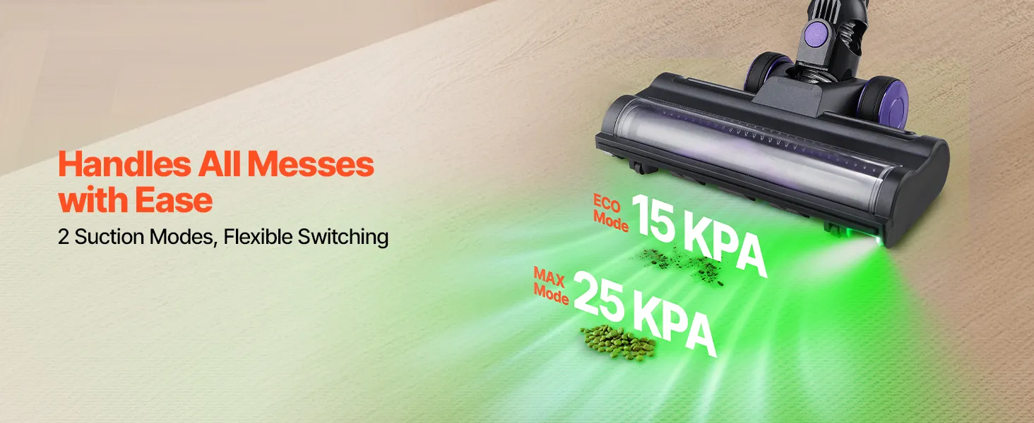 25 kPa sūkšanas jauda un jaudīgs motors: Šis bezvadu putekļsūcējs aprīkots ar jaudīgu motoru ar diviem darbības režīmiem – līdz 25 kPa maksimālajā režīmā un 15 kPa zemajā režīmā. Tas viegli savāc lielākus gružus, mājdzīvnieku spalvas un putekļus no paklājiem, koka un flīžu grīdām, efektīvi nodrošinot ikdienas tīrīšanu.
