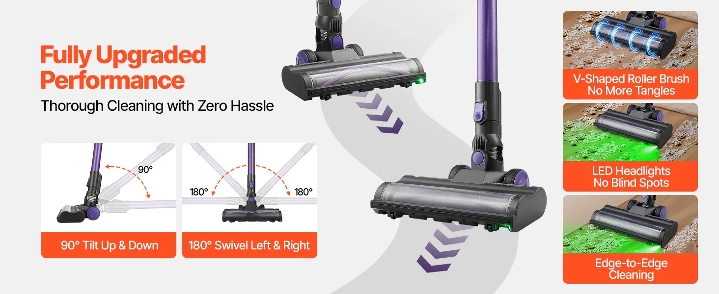 Daudzpusīga tīrīšanas veiktspēja: Elastīgā grīdas birste griežas 180° uz sāniem un 90° uz augšu/leju, ļaujot ērti notīrīt zem mēbelēm un grūti aizsniedzamās vietās, nepārvietojot tās. Komplektā iekļauti vairāki uzgaļi, un spilgtas LED gaismas izgaismo tumšas vietas pilnvērtīgai tīrīšanai.