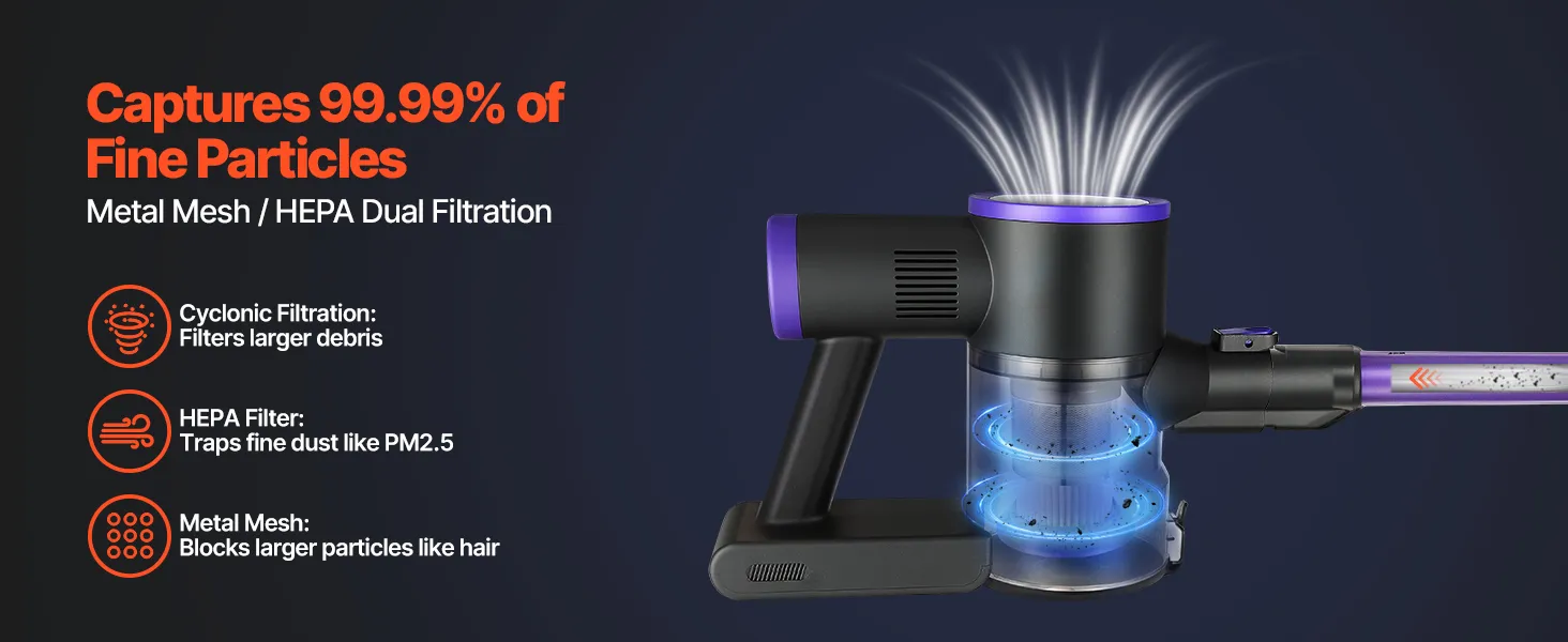 Iepriekš uzstādītais nerūsējošā tērauda siets šim bezvadu putekļsūcējam aiztur matus un lielākas daļiņas, samazinot HEPA filtra noslodzi un pagarinot tā kalpošanas laiku. Kombinācijā ar HEPA filtru tas efektīvi uztver smalkās daļiņas un nodrošina kvalitatīvu gaisa attīrīšanu.