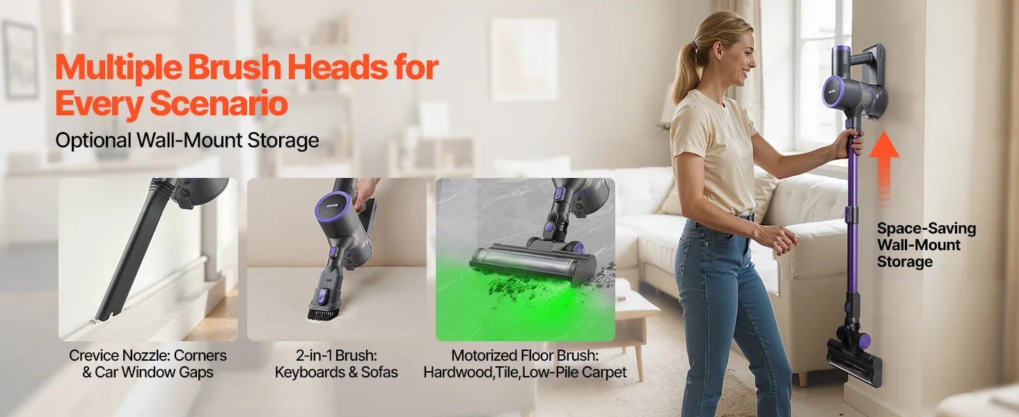 Rokas putekļsūcējs ir aprīkots ar trim maināmiem birstu uzgaļiem, kas paredzēti aizkaru, gultu, dīvānu un citu grūti pieejamu vietu tīrīšanai. Ideāli piemērots visa mājokļa uzkopšanai, efektīvi noņemot mājdzīvnieku spalvas, putekļus un netīrumus no grīdām un paklājiem.