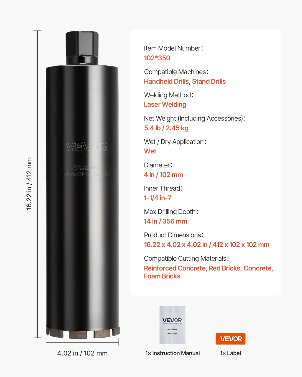 VEVOR dimanta kroņurbis mitrajai urbšanai, diametrs 102 mm, urbšanas dziļums 356 mm, 1-1/4″–7 iekšējā vītne, augstas precizitātes metinājums dzelzsbetonam, ķieģeļiem un mūrim