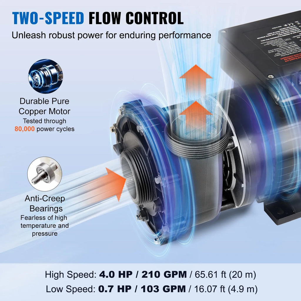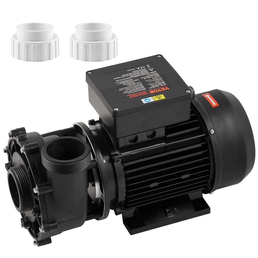 VEVOR divu ātrumu SPA sūknis, 56 rāmis, 1900 W augstais režīms 43 m³/h ar 18 m pacēlumu vai 450 W zemais režīms 21,5 m³/h ar 4,4 m pacēlumu, 2″ pieslēgums ar 90° grozāmu savienojumu, TÜV sertificēts