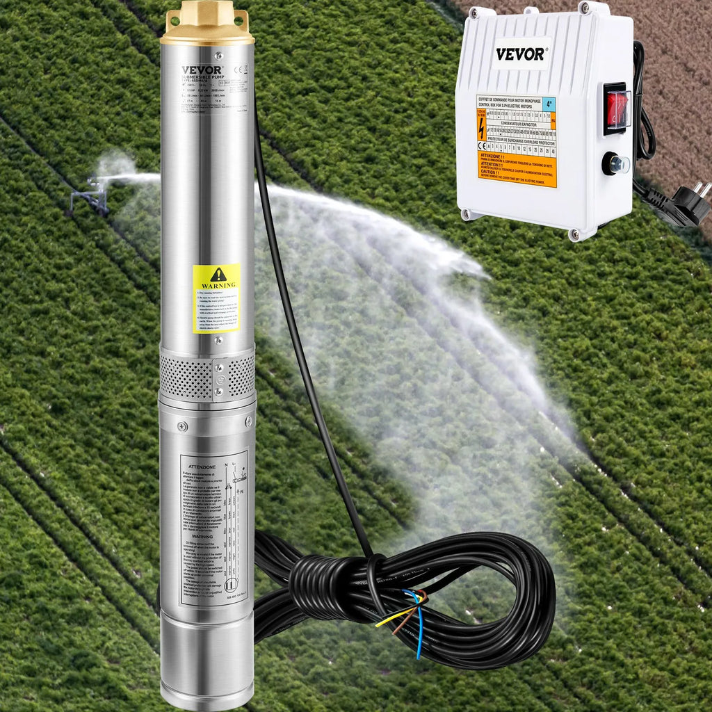 VEVOR dziļurbuma iegremdējamais sūknis 1100 W, 230 V/50 Hz, plūsma līdz 190 l/min, pacelšanas augstums līdz 57 m, 20 m kabelis ar ārēju vadības bloku, 10,2 cm nerūsējošā tērauda korpuss, IP68, rūpniecībai, apūdeņošanai un mājai