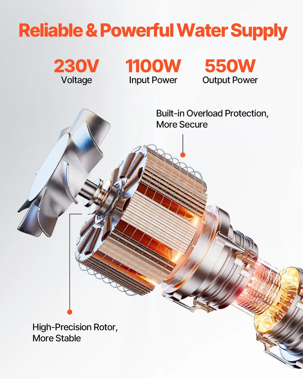 Jaudīgs tīra vara motors: Vara tinuma motors nodrošina spēcīgu un vienmērīgu ūdens padevi. Iebūvēta aizsardzība pret pārkaršanu novērš bojājumus un garantē ilgmūžīgu, drošu ekspluatāciju.