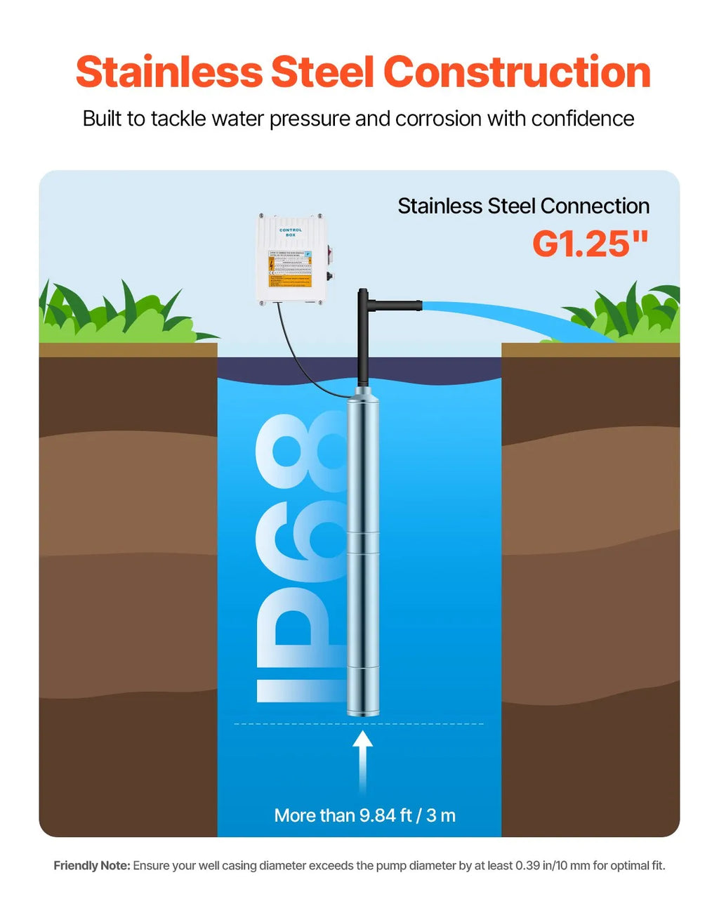 Izgatavots ar nerūsējošā tērauda izplūdi, nerūsējošā tērauda savienojumiem un pastiprinātu sūkņa korpusu, šis dziļurbuma iegremdējamais ūdens sūknis ir izturīgs, noturīgs pret koroziju un paredzēts ilgstošai ekspluatācijai.