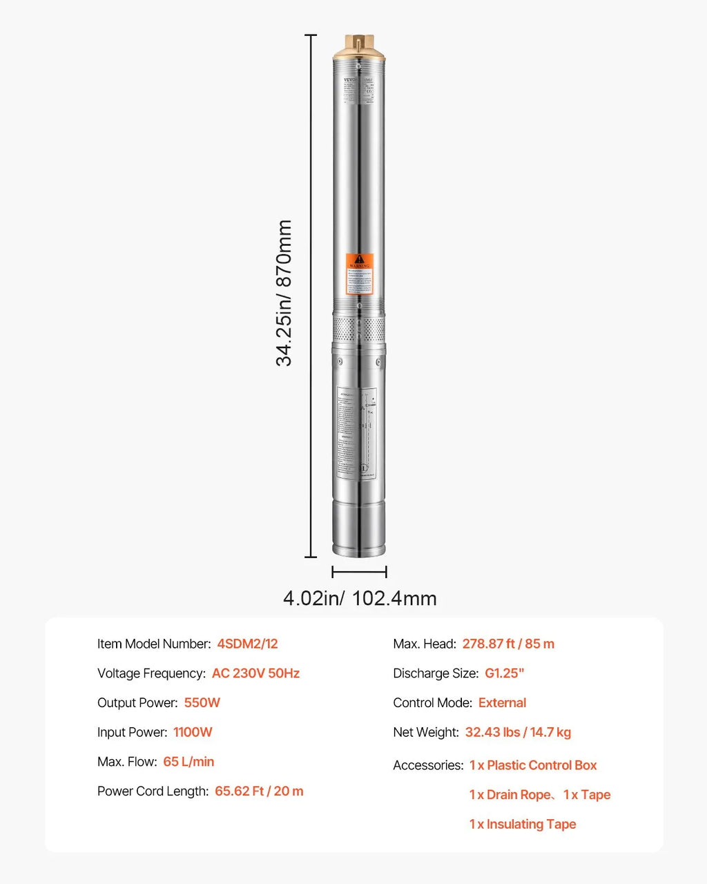 Liela plūsma un augsts pacelšanas augstums: Dziļurbuma iegremdējamais sūknis ar 1100 W ieejas jaudu un 550 W izejas jaudu nodrošina augstu veiktspēju. Maksimālais pacelšanas augstums līdz 85 m un plūsma līdz 65 l/min nodrošina stabilu ūdens spiedienu un nepārtrauktu padevi dažādiem pielietojumiem.