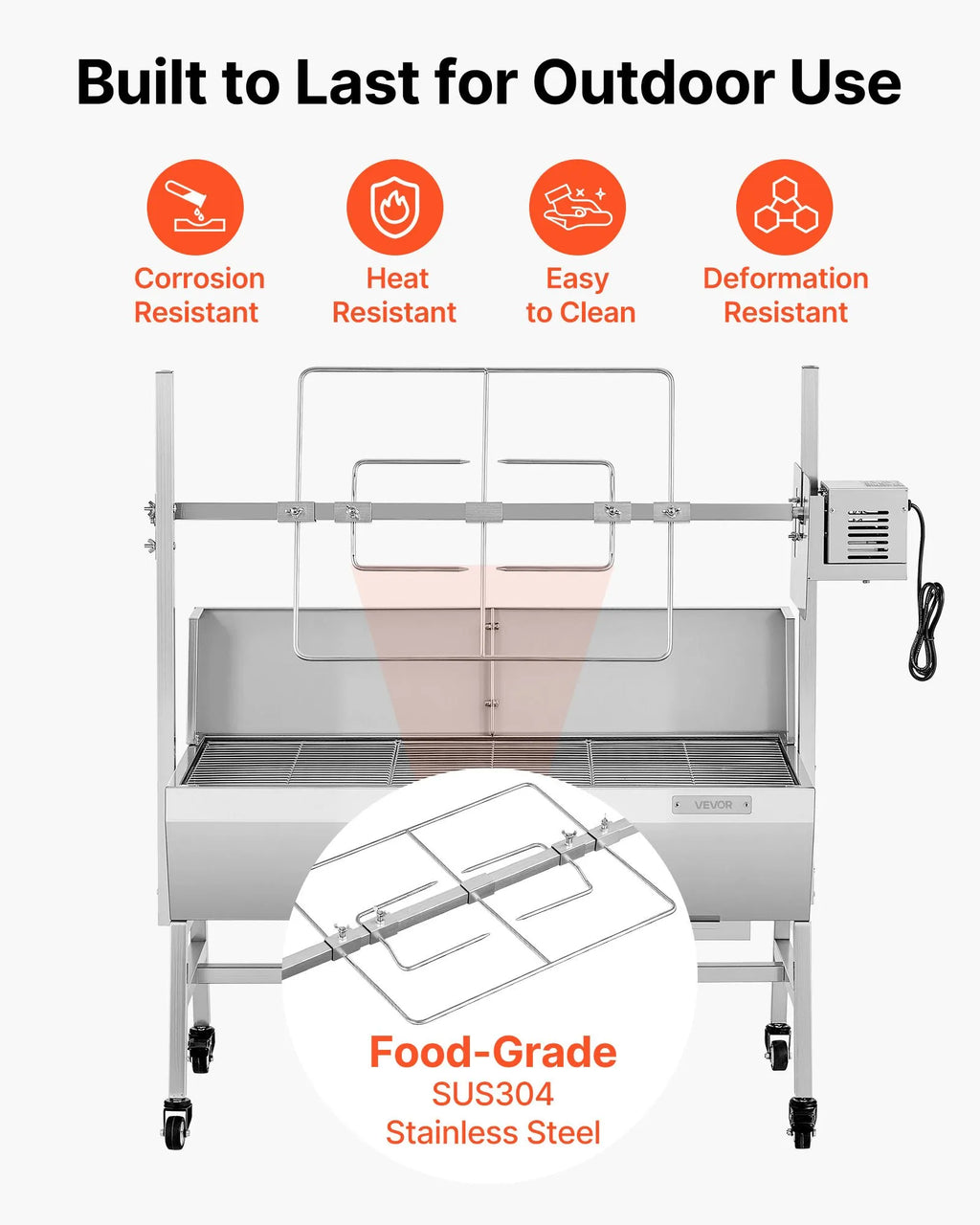 Stabila mobilitāte Aprīkots ar pārvietošanās riteņiem un bremzēm, šis rotācijas grils ir viegli pārvietojams un droši fiksējams, nodrošinot pilnīgu kontroli gatavošanas laikā ārpus telpām.