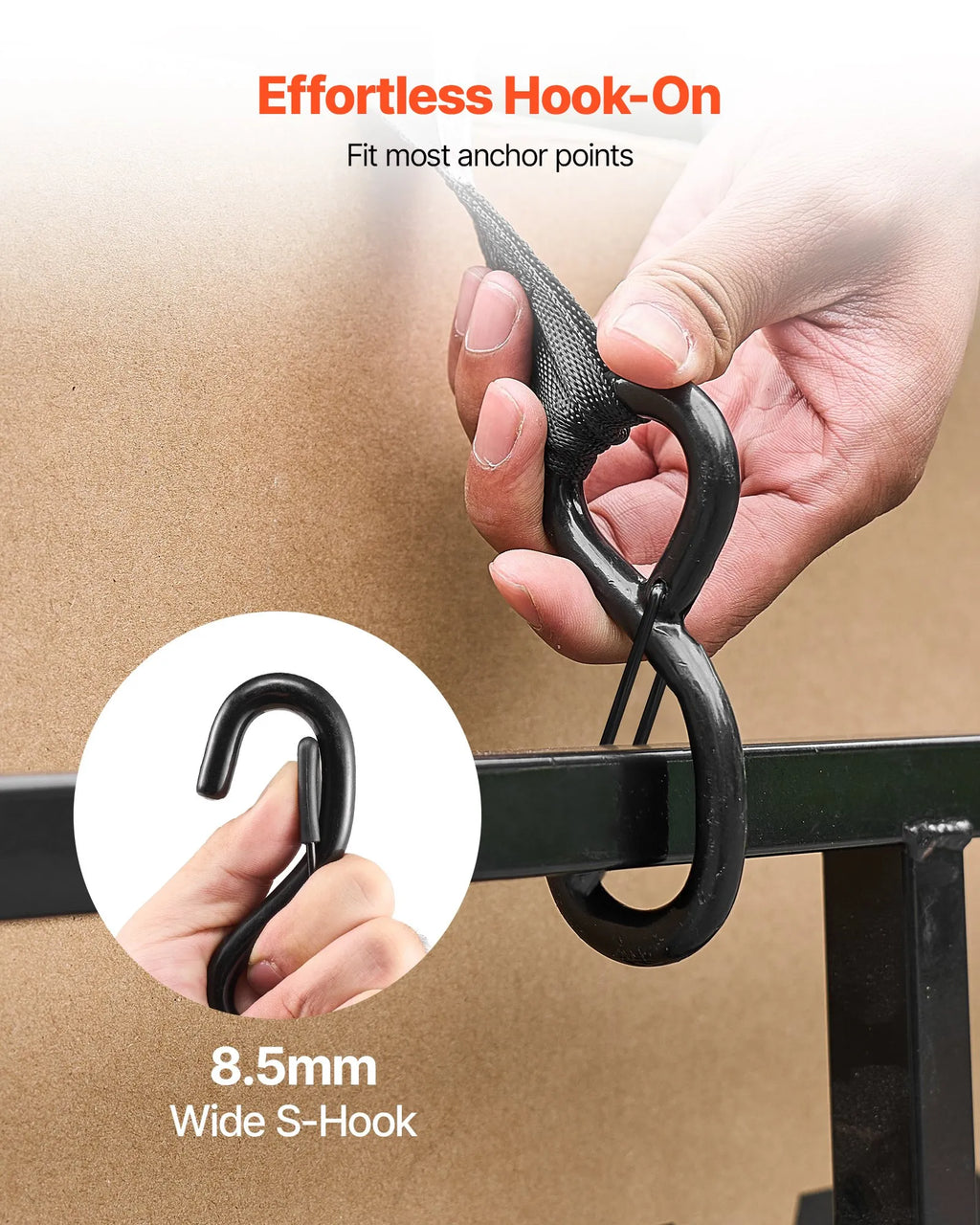 Ātra piestiprināšana: Plaša atvēruma S veida āķi ļauj dažu sekunžu laikā piestiprināt siksnas pie kravas stiprinājumiem kravas kastē, piekabē vai enkura punktiem, nodrošinot drošu fiksāciju ikdienas pārvadājumos.