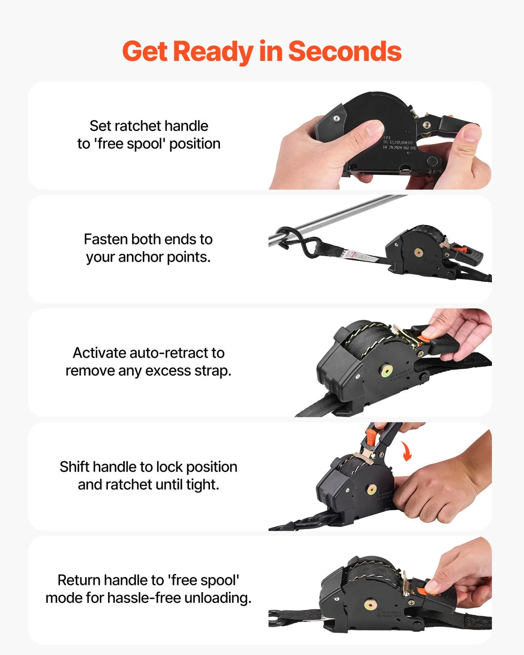 Kravu var pievilkt dažu sekunžu laikā un braukt droši. Šī universālā sprūdrata siksna droši nostiprina aprīkojumu uz automašīnām, kravas auto vai piekabēm un samazina kravas kustību no izbraukšanas vietas līdz galamērķim.