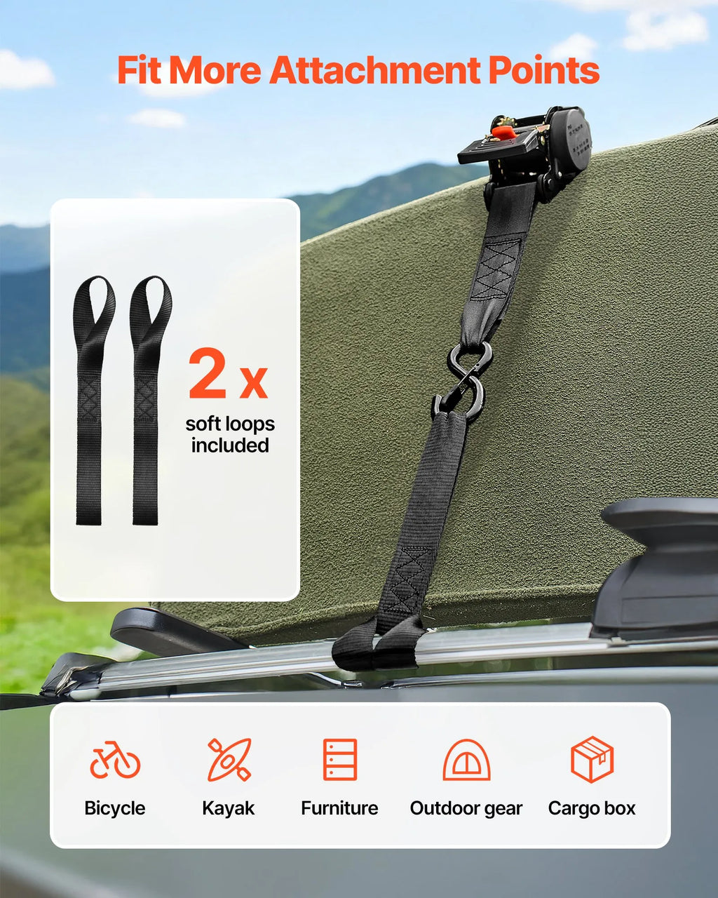 Komplektā 2 mīkstās cilpas: Divas mīkstās cilpas ļauj izveidot saudzīgus stiprinājuma punktus uz bagāžniekiem vai margām, aizsargājot virsmas un paplašinot nostiprināšanas iespējas mēbelēm, kajakiem u.c.
