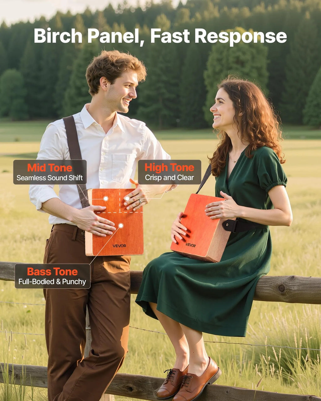 Dabīgā bērza spēcīgais skanējums: Cajon bungas izgatavotas no augstvērtīga bērza, kas precīzi reaģē uz katru pieskārienu. Silti, dziļi basi un dzidras augšas nodrošina dabisku un atsaucīgu skanējumu.