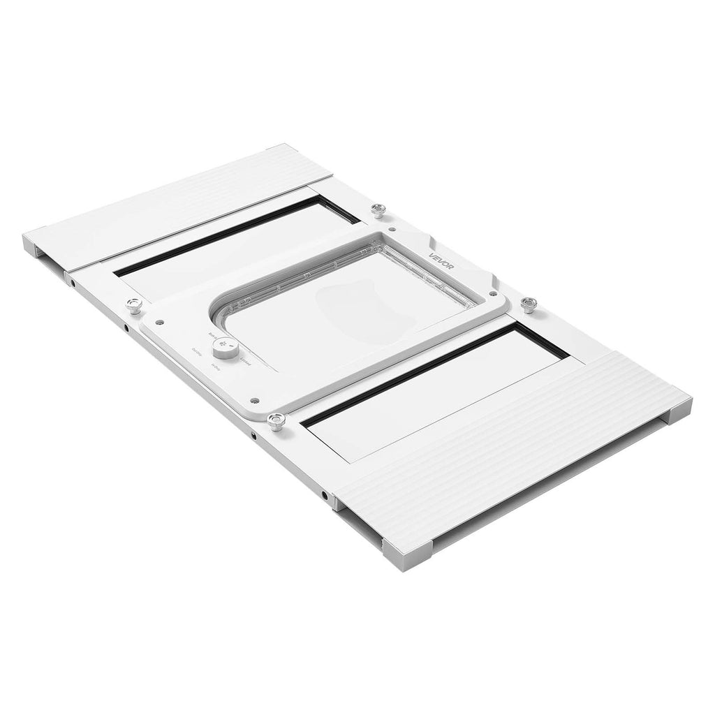 VEVOR kaķu durtiņas logam, regulējamas loga platumam 584–711 mm, 4 droši bloķēšanas režīmi, alumīnija rāmis ar augstas caurspīdības stiklu, magnētiska aizvēršanās, laikapstākļu izturīgas ātrās uzstādīšanas durtiņas kaķiem, baltas