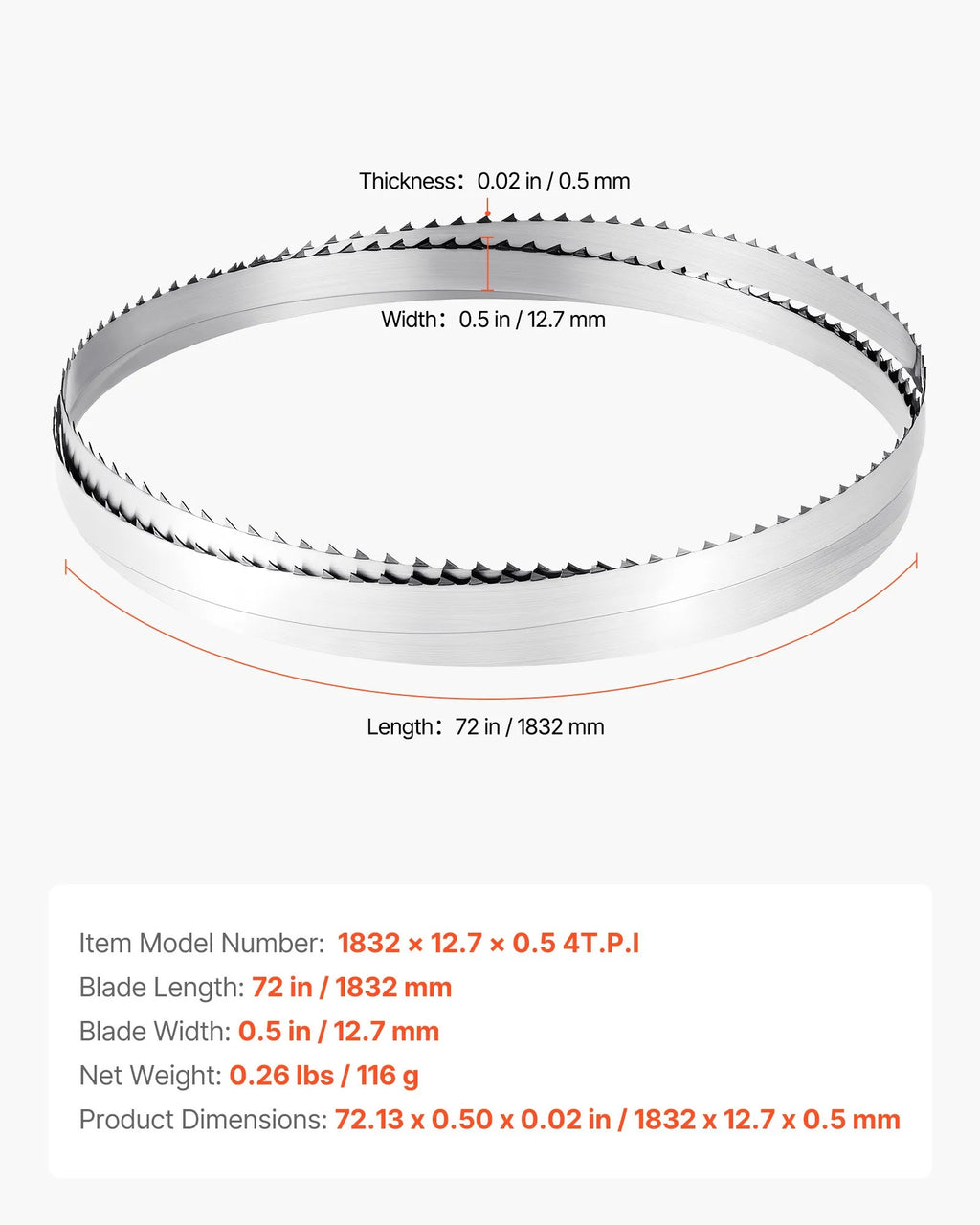 VEVOR lentzāģa asmens 1832 mm, 4 TPI, no SK5 augstas izturības oglekļa tērauda ar rūdītiem 18 HRC asiem zobiem, 12,7 mm platums, rezerves asmens kokapstrādes lentzāģiem, 1 gab.