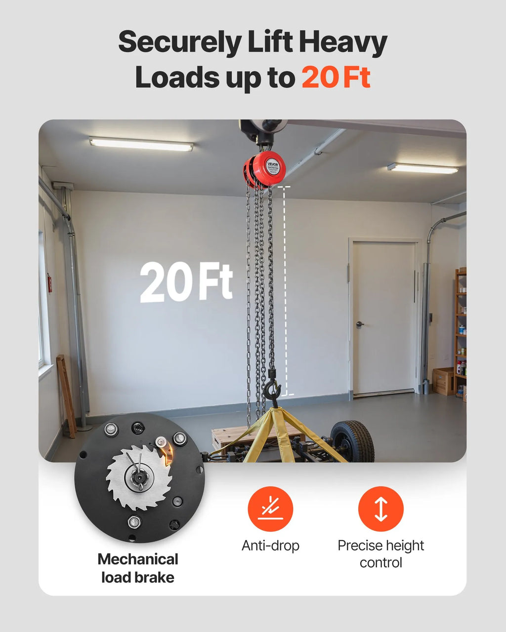 1000 kg izturīga celtspēja: Šis rokas ķēdes pacēlājs viegli tiek galā ar smagu priekšmetu celšanu, nodrošinot līdz 1000 kg celtspēju un 6 m pacelšanas augstumu. Ideāli piemērots garāžām, būvlaukumiem un noliktavām.