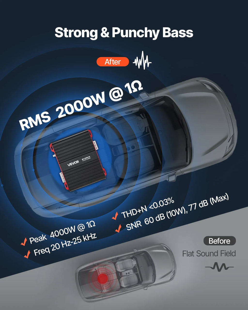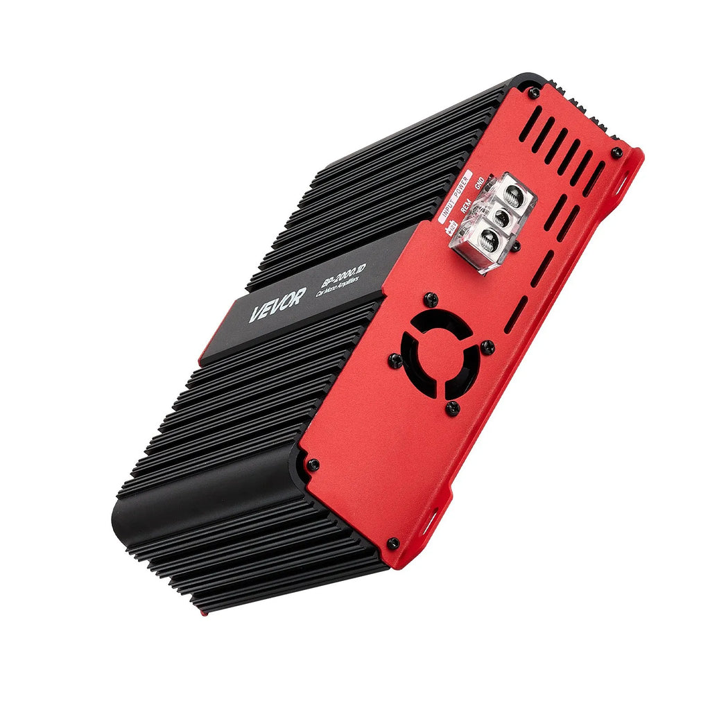 VEVOR monobloka automašīnas pastiprinātājs, līdz 2000 W, stabils 1/2/4 Ω, 1 kanāla D klases audio pastiprinātājs ar tālvadāmu zemfrekvenču līmeņa kontroli, zemfrekvenču filtru un basu pastiprinājumu, komplektā skaļuma regulators