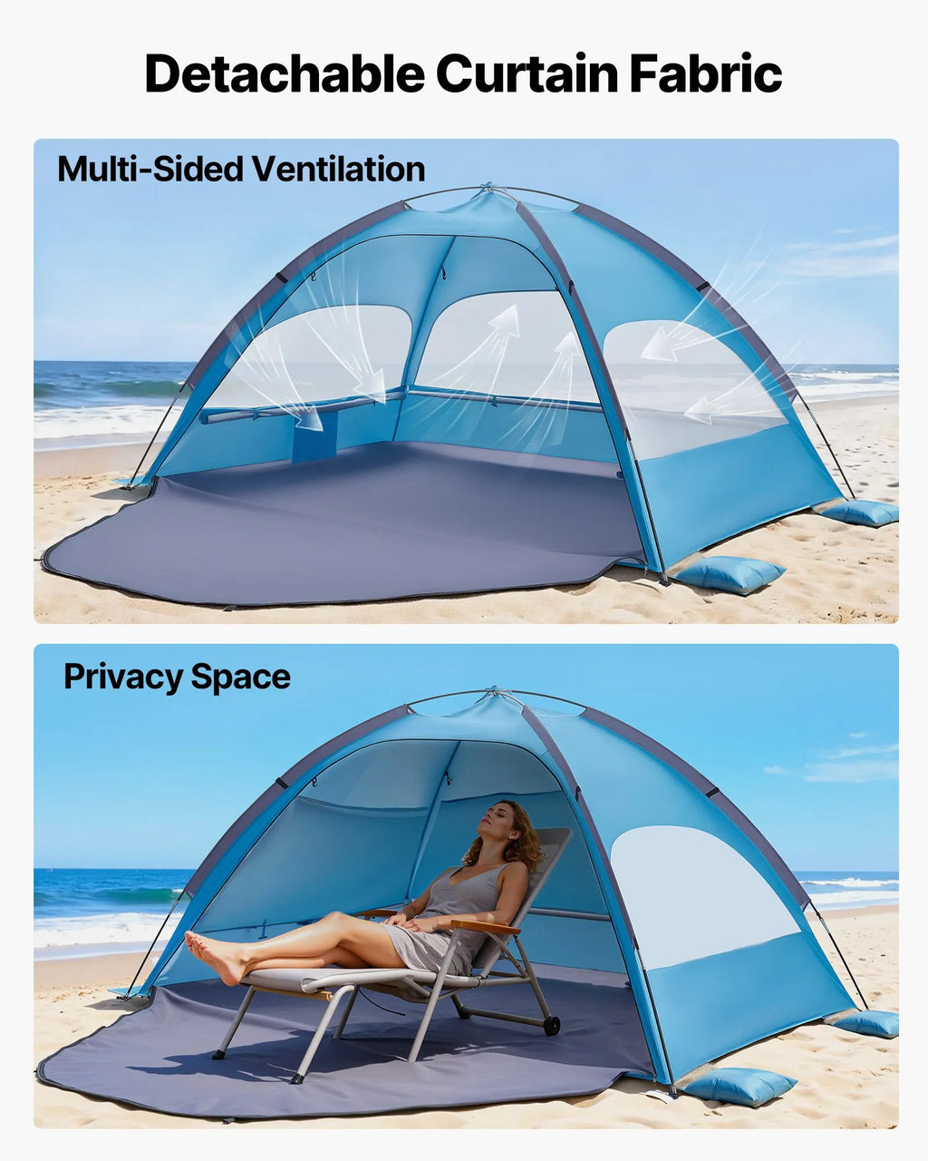 Ventilācija un privātums: Aprīkota ar noņemamiem aizkariem, kempinga nojume ļauj tos sarullēt labākai daudzpusīgai ventilācijai vai aizvērt, lai izveidotu privātu telpu. Nodrošina elastīgu un lietotājam ērtu pielāgošanu jebkurai atpūtas dienai pludmalē.