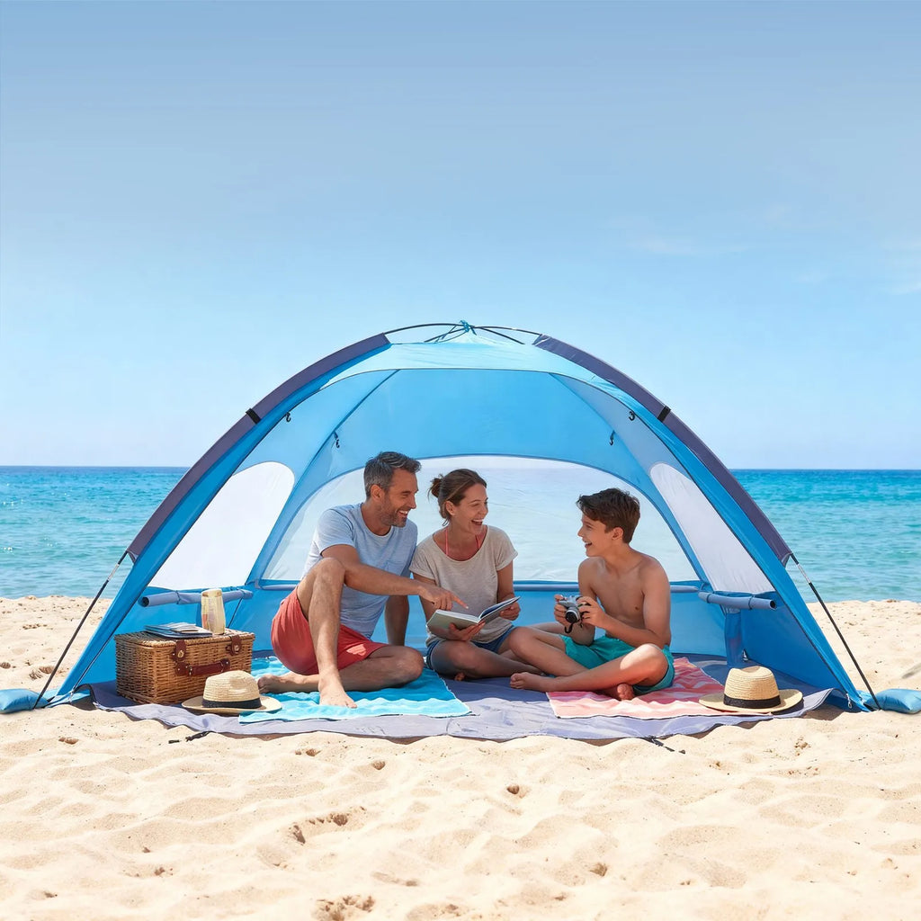 Pludmales telts 3 personām: Paredzēta trīs personām, šī pludmales telts nojume nodrošina plašu ēnas zonu un komfortablu vietu atpūtai. Uzstādīšana ir vienkārša — montāža aizņem tikai dažas minūtes bez lieka stresa.
