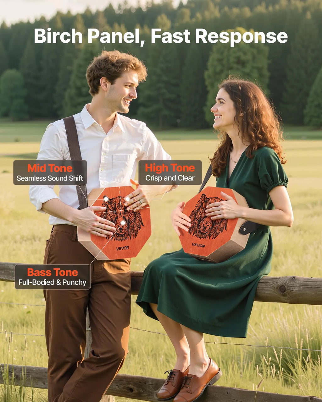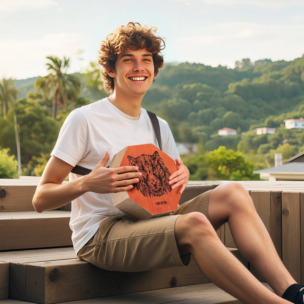 VEVOR unikālais kahona bungas instruments ar iekšējām stīgām, pārnēsājama koka perkusiju kaste ar regulējamu siksnu, bērza koka korpuss, piemērots iesācējiem un profesionāļiem, 295 × 295 × 100 mm