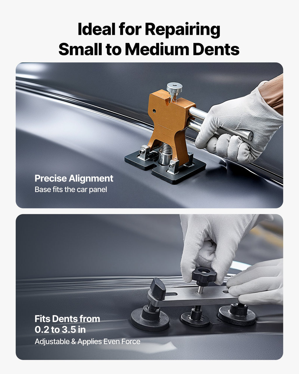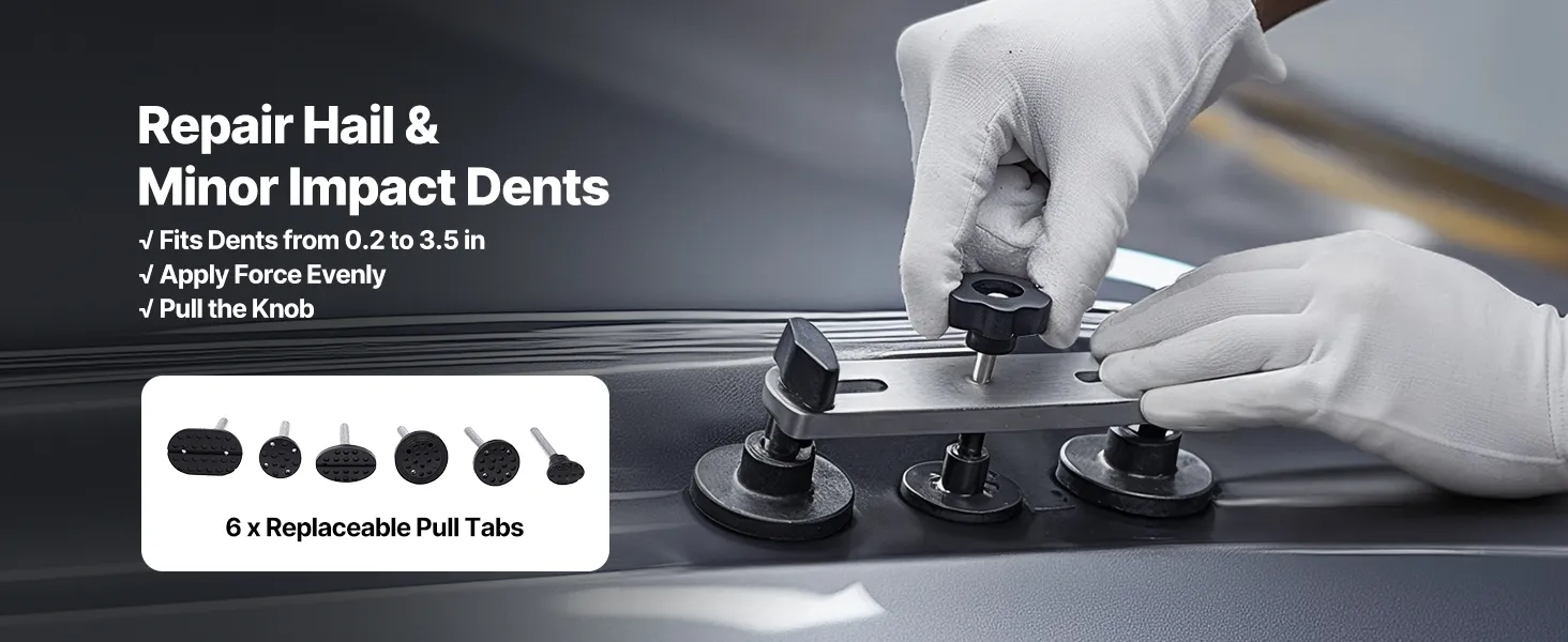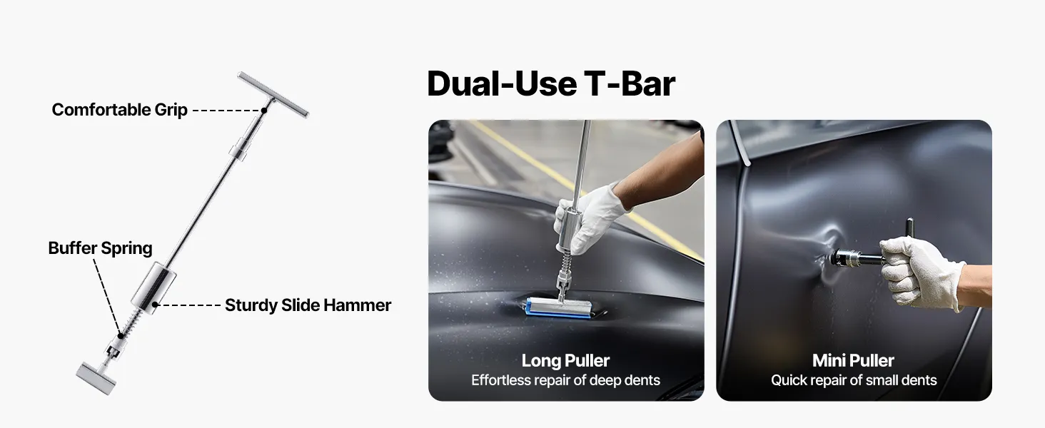 Vienkārša dziļo iedobumu labošana: Šajā komplektā iekļautais 2 vienā vilkšanas stienis pārveidojas par garu T-veida stieni ar slīdošo āmuru, nodrošinot lielu vilkšanas jaudu ar mazāku piepūli. Komplektā ir trīs jaudīgi piesūcekņi lielu iedobumu novēršanai bez līmes.