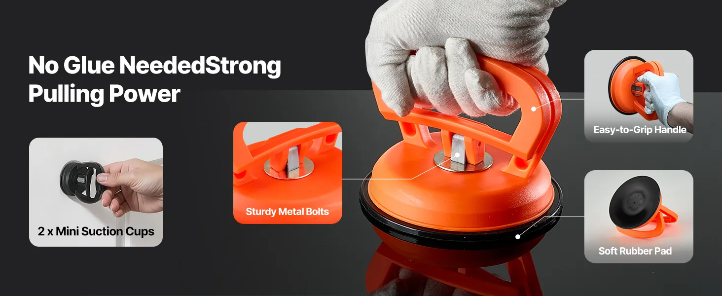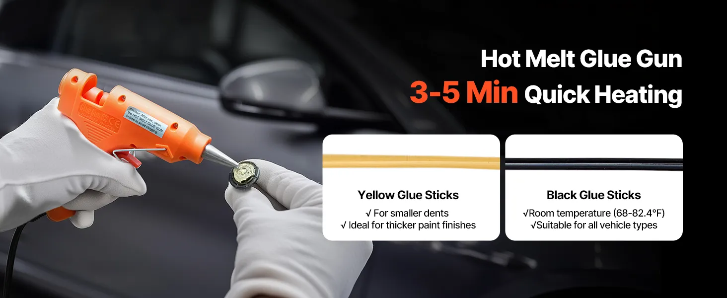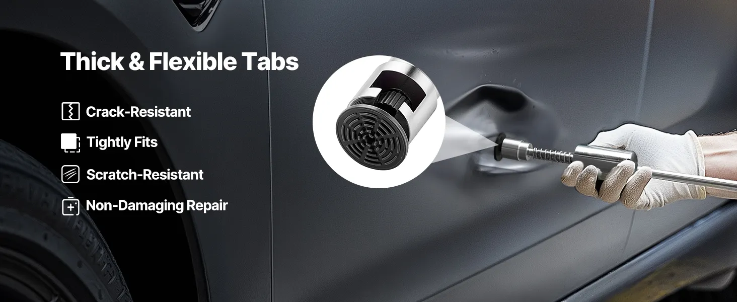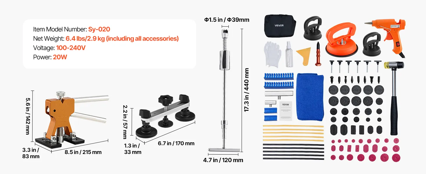 Vienkārša dziļo iedobumu labošana: Šajā komplektā iekļautais 2 vienā vilkšanas stienis pārveidojas par garu T-veida stieni ar slīdošo āmuru, nodrošinot lielu vilkšanas jaudu ar mazāku piepūli. Komplektā ir trīs jaudīgi piesūcekņi lielu iedobumu novēršanai bez līmes.