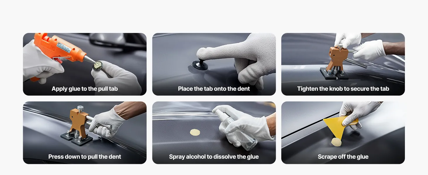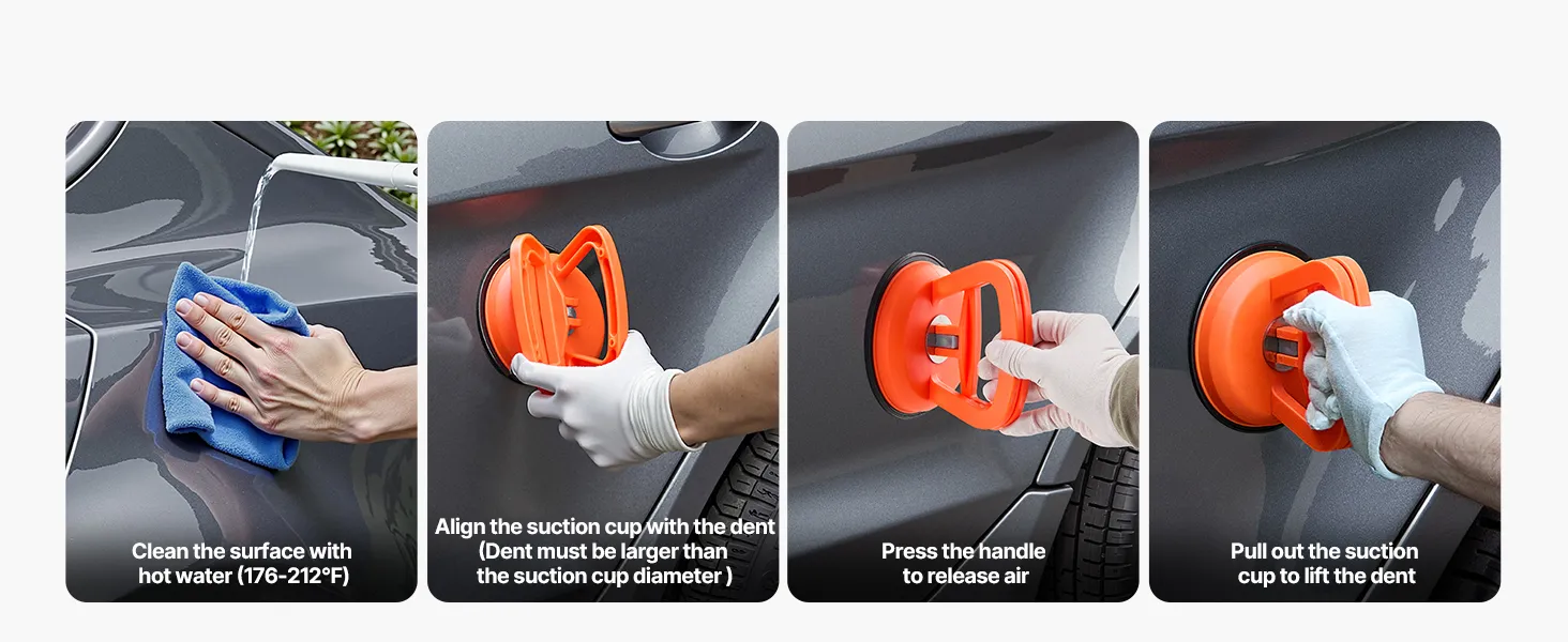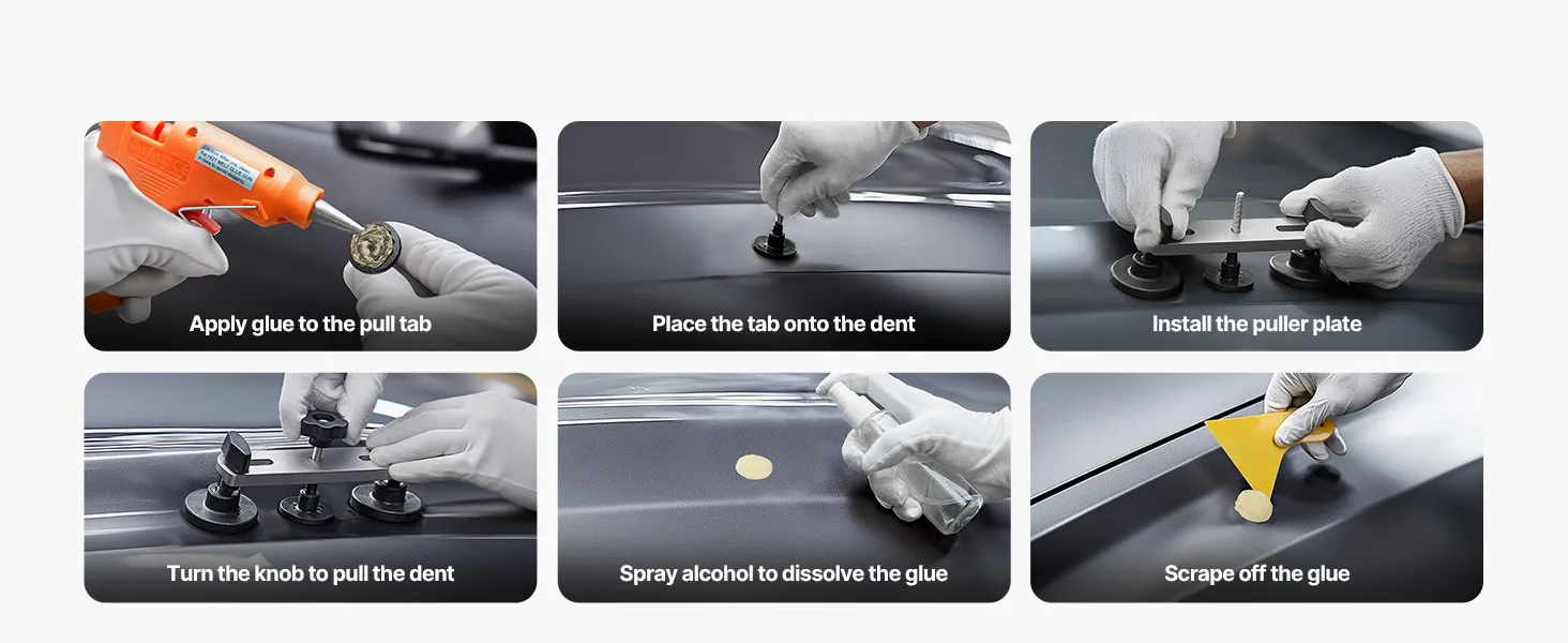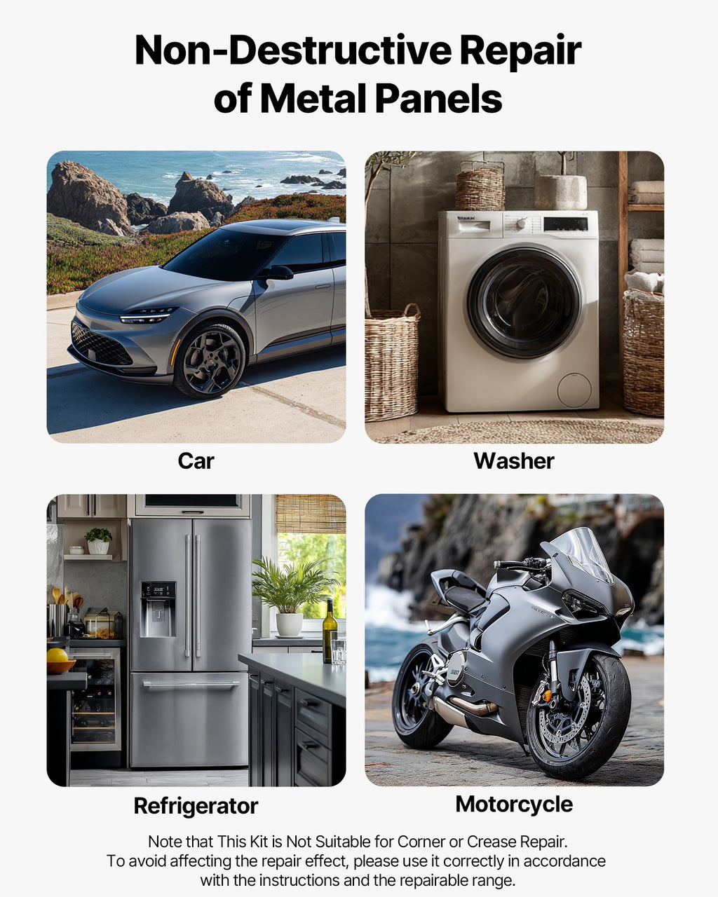 Daudzfunkcionāls remonta rīks: Šis iedobumu noņemšanas komplekts ir piemērots ne tikai automašīnām, bet arī metāla virsmām, piemēram, ledusskapjiem, veļas mašīnām un citiem sadzīves priekšmetiem. Piezīme: nav ieteicams transportlīdzekļiem ar pārkrāsotām vai iepriekš remontētām virsbūvēm.
