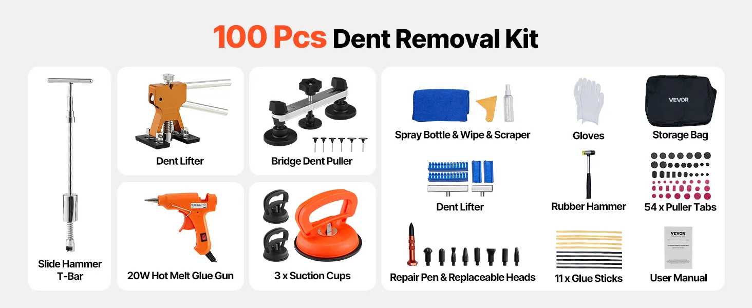100 gab. bezkrāsas iedobumu novēršanas komplekts: Komplektā ir viss nepieciešamais, ievietots ērtā instrumentu somā: 1 × slīdošais āmurs, 1 × iedobumu pacēlājs, 1 × tilta vilcējs, 3 × piesūcekņi, 1 × remonta pildspalva, 9 × maināmie uzgaļi, 1 × gumijas āmurs, 54 × vilkšanas plāksnītes un citi piederumi.