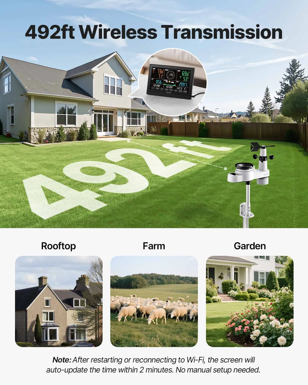 5-in-1 āra sensors: Uzrauga temperatūru, mitrumu, nokrišņus, vēja ātrumu un virzienu, kā arī aprēķina rasas punktu, mēness fāzes un sniedz 6–12 stundu prognozes (attēlotas tikai uz iekštelpu ekrāna). Sensora iekšējie komponenti ir pilnībā uzlaboti, lai labāk izturētu lietus ūdens iekļūšanu. Nokrišņu mērītājs, vēja spārns un termometrs ir iepriekš uzstādīti, ietaupot jūsu uzstādīšanas laiku.