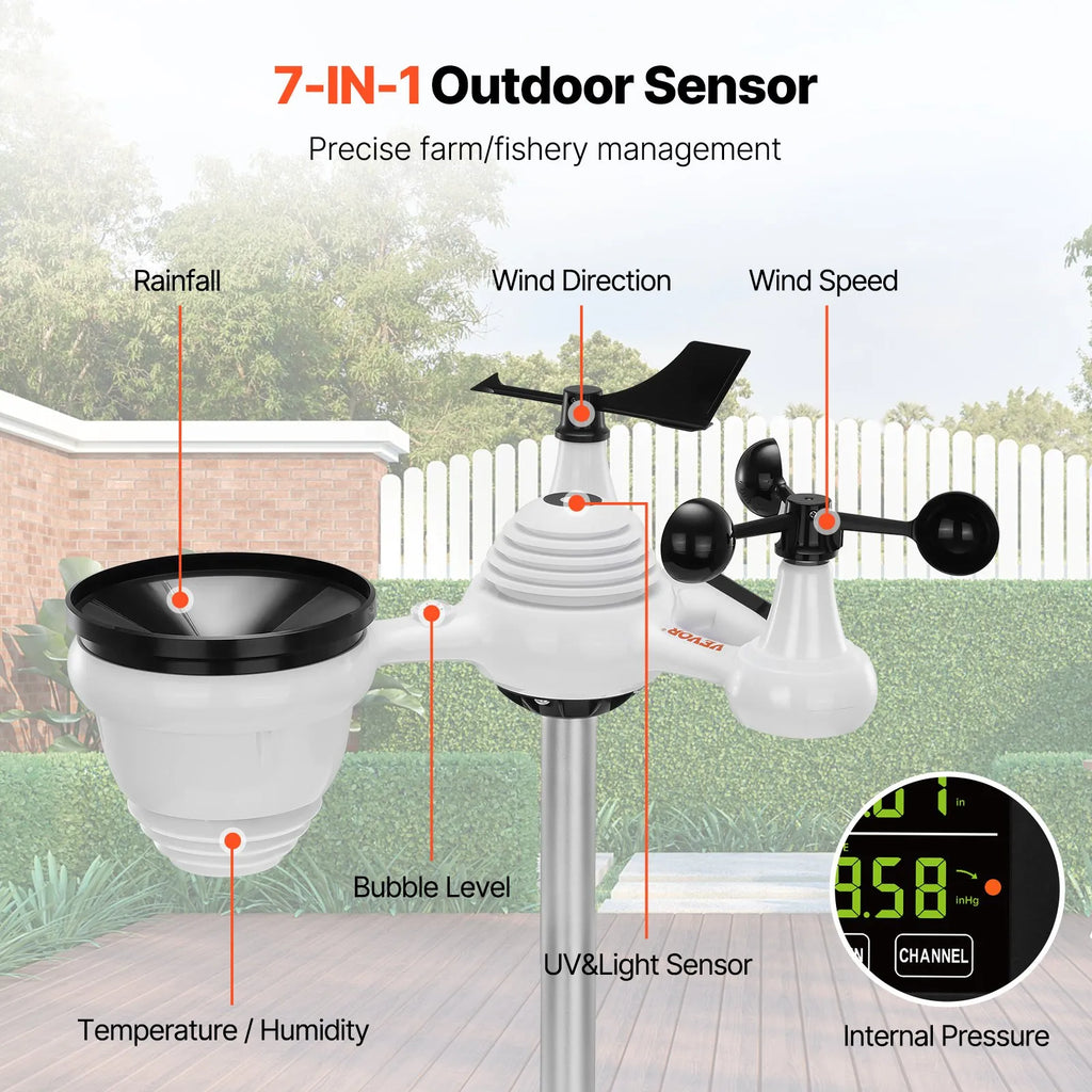 7-in-1 bezvadu laika apstākļu stacija ar 19 cm krāsu displeju, iekštelpu un āra temperatūras, mitruma, vēja, nokrišņu un UV rādījumu uzraudzībai ar prognožu un trauksmes funkcijām