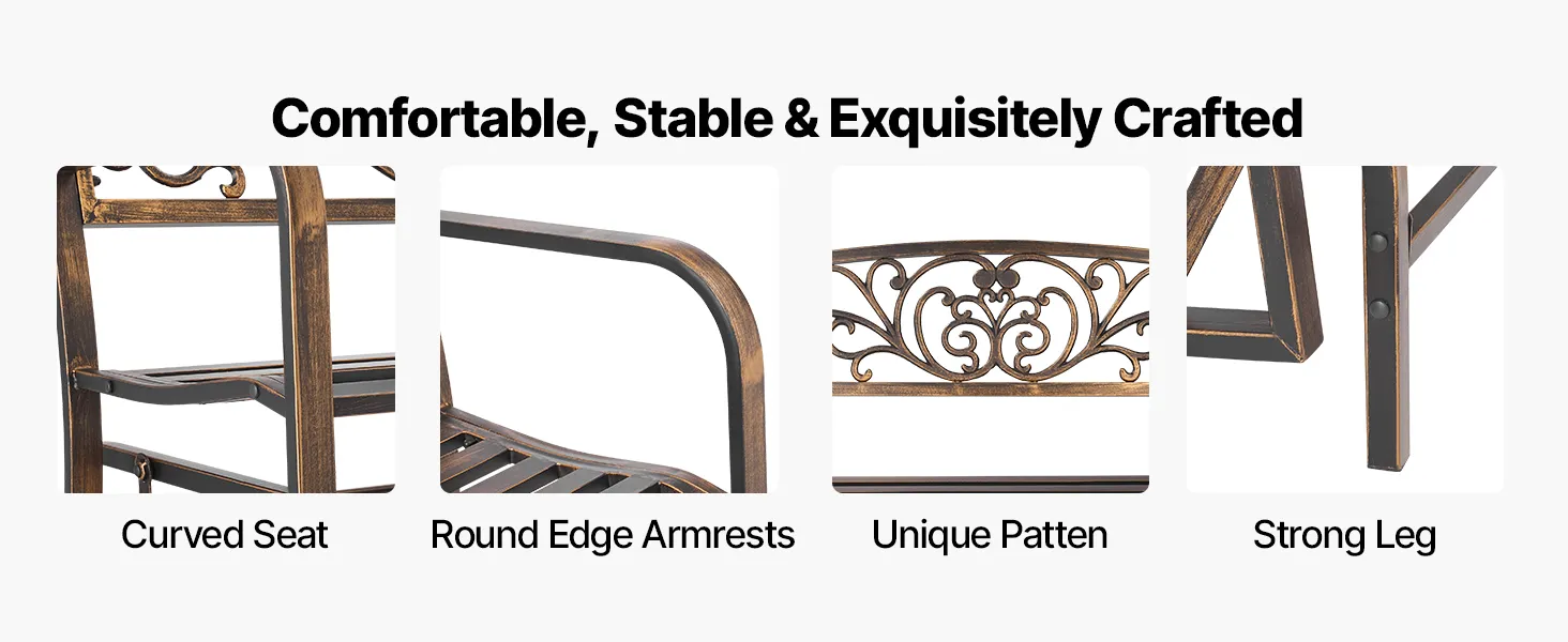 Piemērots āra apstākļiem: Šim āra solam ir augstas kvalitātes metāla rāmis un dekoratīva čuguna atzveltne ar unikālu rakstu, kas iztur sauli, lietu un sniegu, neplaisājot, nedeformējoties un nerūsējot. Stabils un ilgmūžīgs dizains nodrošina drošu lietošanu ilgtermiņā.